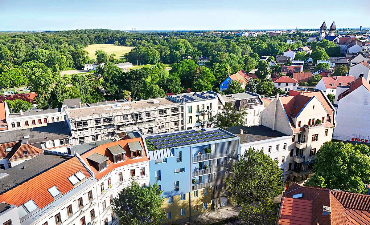 Das Neubau-Ensemble im dynamischen Kleinzschocher umfasst 16 Wohneinheiten im Vorderhaus und 11 Wohneinheiten im Hinterhaus. Es entstehen Wohnungsgrößen zwischen 34 und 118 Quadratmetern, verteilt auf 1 bis 5 Zimmern.