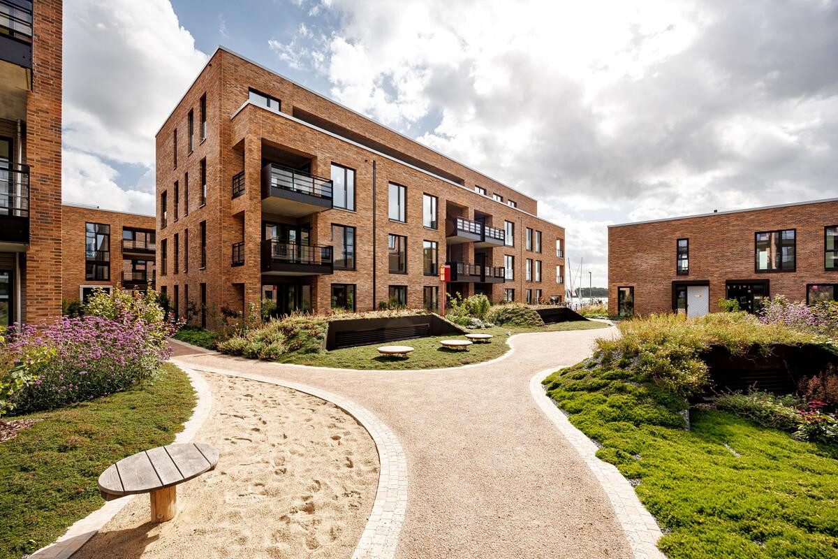 Der Reiz eines Fischereihafens, das faszinierende Milieu aus traditionellen Bootswerften und Fischereibetrieben – die Architektur atmet alles sensibel ein und komponiert daraus zwölf miteinander verwobene Häuser in unterschiedlichen Höhen und einer lang gezogenen Silhouette, die an das wogende Meer erinnert. Außen finden sich geschützte Loggien, innen öffnen sich Balkone mit einem fantastischen Blick über die sorgfältig und schön angelegten Innenhöfe – zur Travemündung und zum Priwall hin.