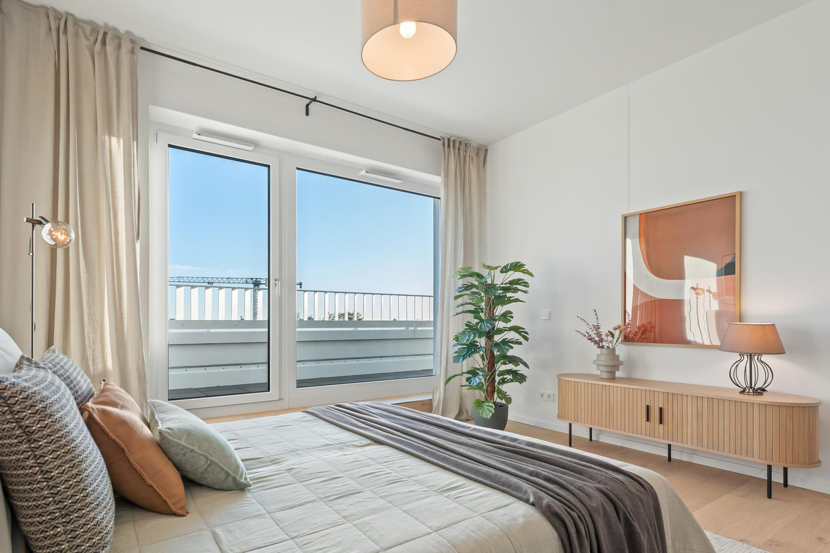 Die zurückgesetzte Lage schafft Ruhe und schützt vor Straßenlärm. Die Gebäudeform und der freie Blick nach Osten schaffen eine entspannte Wohnatmosphäre mitten in Neukölln. Weitläufige Terrassen und großzügige Wohnflächen sprechen Paare und Menschen mit hohen Ansprüchen an Wohnen und Lebensqualität an.