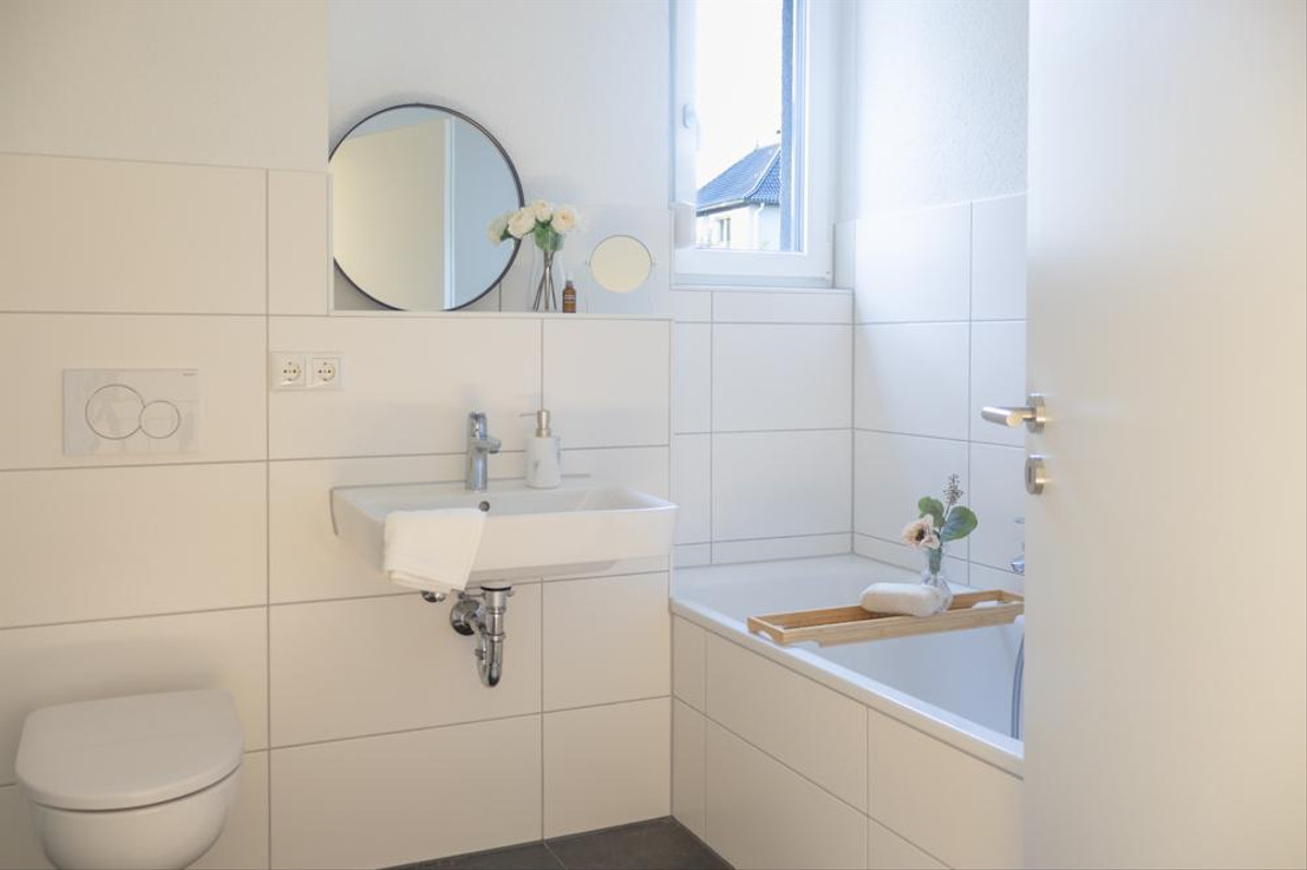• Moderne Sanitärausstattung in Gäste-WC und im Badezimmer mit großem Fenster