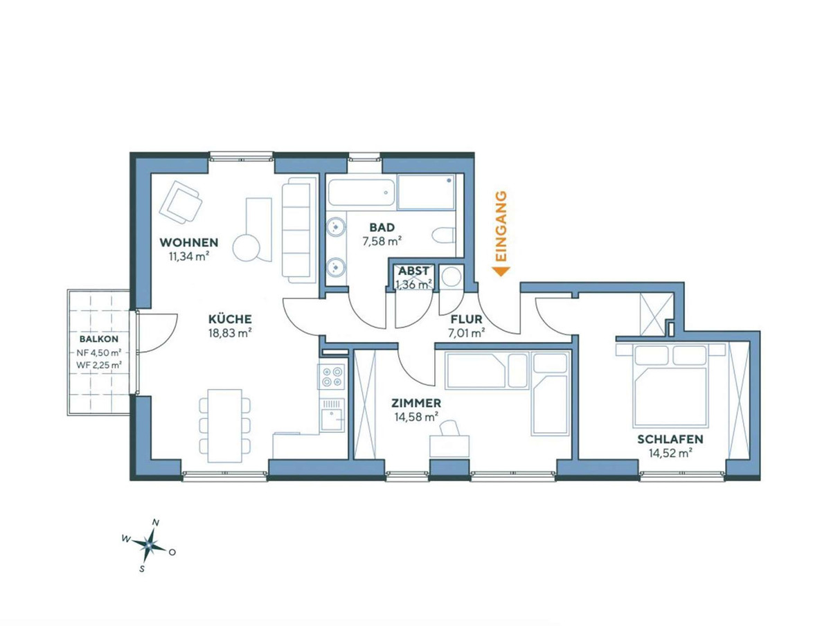 Einen wahrhaft goldenen Feierabend verspricht diese Wohnung im ersten Stock: Auf dem West-Balkon Richtung unverbautem Grün, lassen sich Sommertage wunderbar bei einem Wein ausklingen. Und in der dunklen Jahreszeit? Bleibt das Wohnzimmer dank Süd-West-Ausrichtung herrlich hell. Und ob Strand- oder Schlittentsaison, das Vollbad mit Dusche, Badewanne und zwei Waschbecken erfrischt das ganze Jahr über.