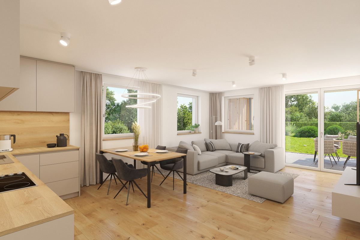Wir bauen nachhaltig in allen Dimensionen. Die Architektur mit Holzelementen und typischen Satteldach fügt sich harmonisch in die Umgebung ein. Massive Wohnungstrennwände und Geschossdecken sorgen für den notwendigen Schallschutz. Private Nischen im Garten und Balkon sowie Sonnen und Blickschutz an den Fenstern sorgen für private Momente. Eine PV-Anlage auf dem Dach sorgt für eine nachhaltige Stromversorgung. Das nachhaltige Konzept wird durch eine Zertifizierung und den energetischen Standard KfW 40 abgerundet. Hierbei erhalten Sie ein zinsvergünstigtes Darlehen der KfW über 150.000 €.
