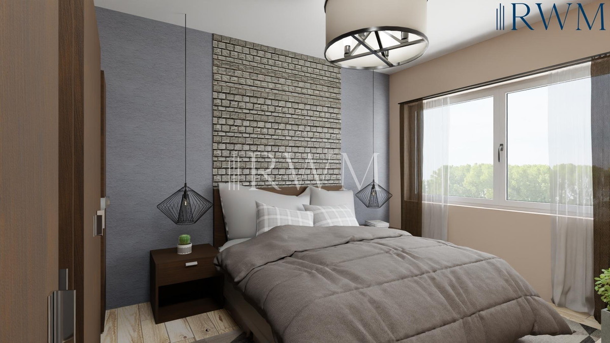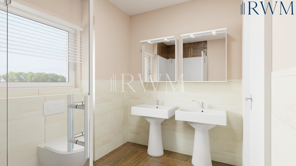 Über das Treppenhaus oder den Aufzug gelangen Sie direkt zur 3-Zimmer-Wohnung, die sich im 1. Obergeschoss des Hauses befindet. Sie betreten den Flur und auf der rechten Seite befindet sich das Badezimmer, das mit einer bodengleichen Dusche, einer Toilette und zwei hochwertigen Waschtischen ausgestattet ist. Daneben liegt die Tür zum Schlafzimmer, das ausreichend Platz bietet.