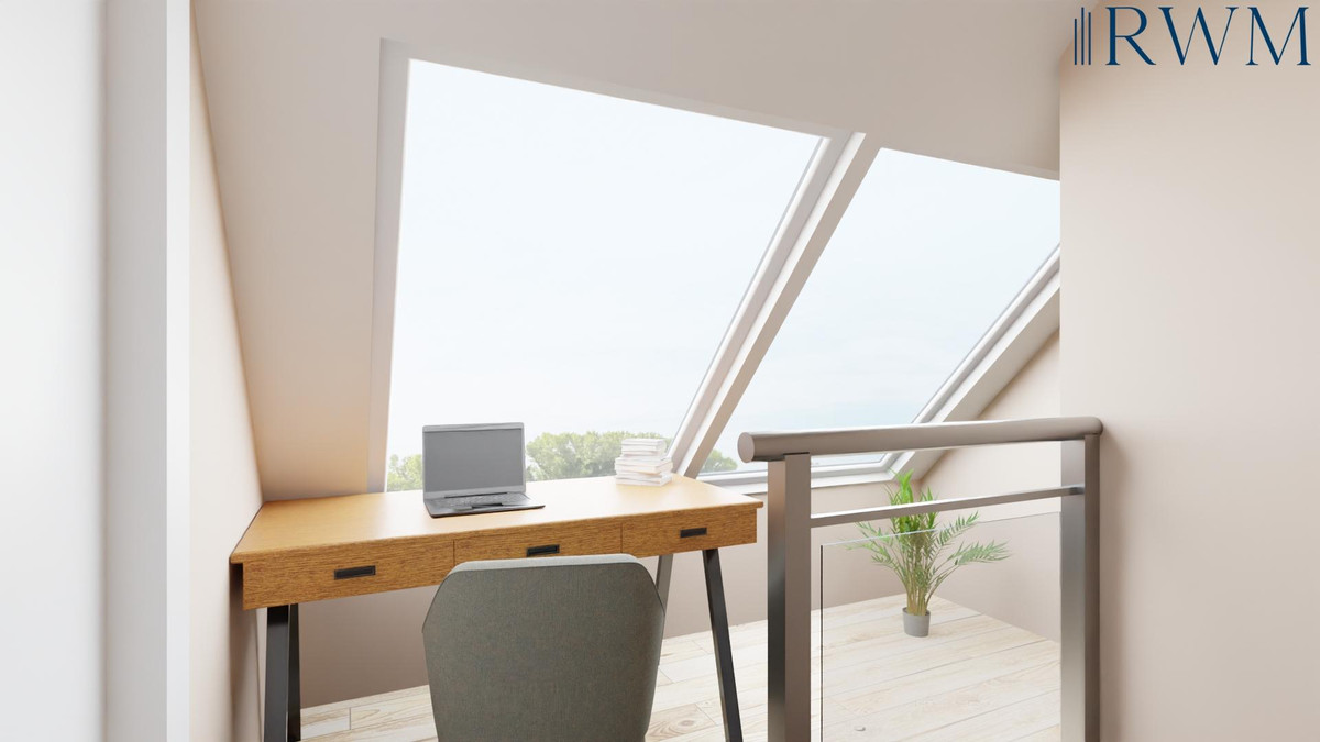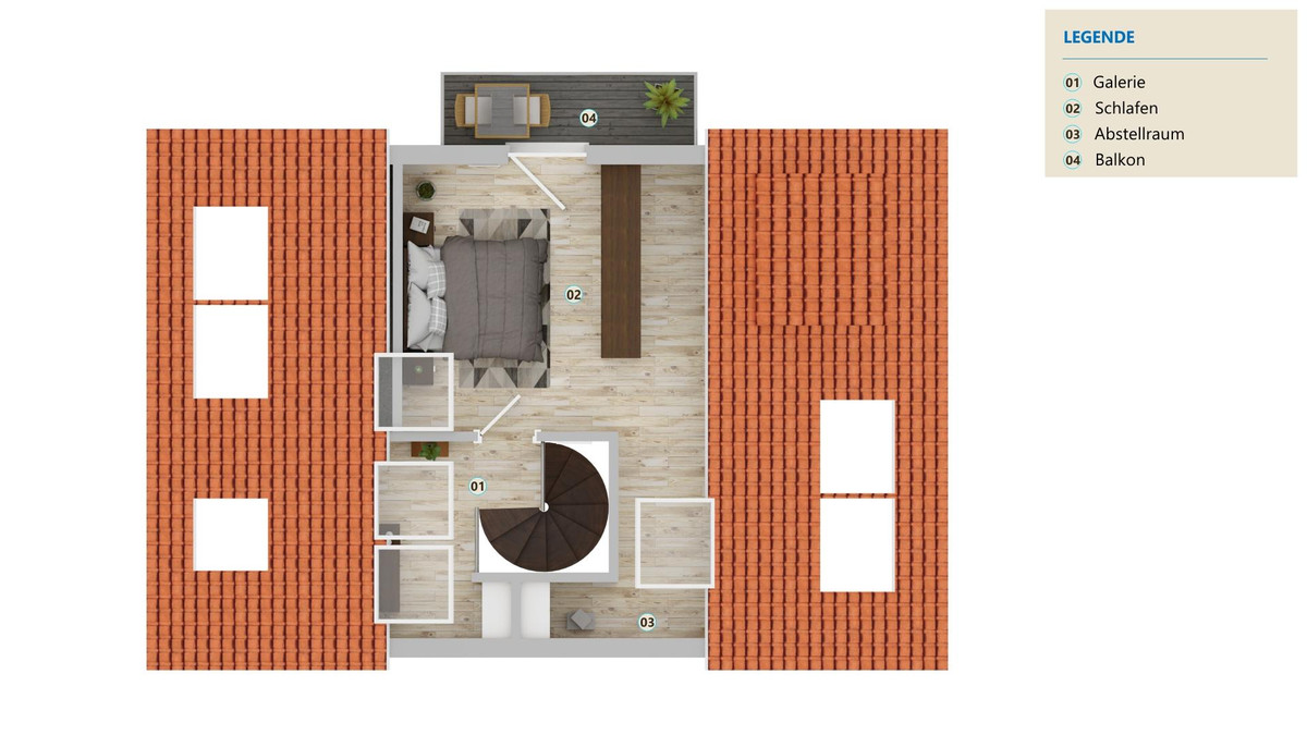 Im Flur führt die Wendeltreppe in obere Dachgeschoss. Hier befindet sich eine kleine Galerie, die ideal auch als Arbeitsplatz genutzt werden kann. Auf dieser Ebene das große Schlafzimmer, das genügend Platz und großzügige Abstellflächen bietet. Vom Schlafzimmer haben Sie Zugang zum Süd-Balkon.