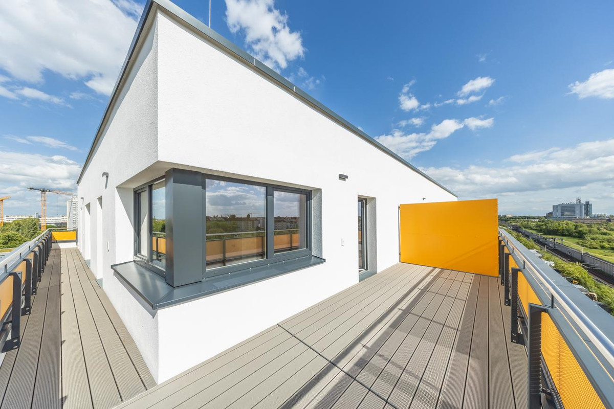 Für BUWOG AM NEUEN PARK hat das renommierte Architekturbüro Tchoban Voss ein Ensemble aus insgesamt fünf Punktgebäuden entworfen: vier siebengeschossige Gebäude und als markanten Akzent ein elfgeschossiges Hochhaus, das den urbanen Charakter des Standorts widerspiegelt. Die Geradlinigkeit der zeitlosen Architektur wird durch farblich gestaltete Balkone und Dachterrassen unterstrichen, die sich jeweils über die gesamte Front erstrecken. So bietet Ihre neue Eigentumswohnung in BUWOG AM NEUEN PARK einen herrlichen Ausblick für die schönsten Stunden des Tages.