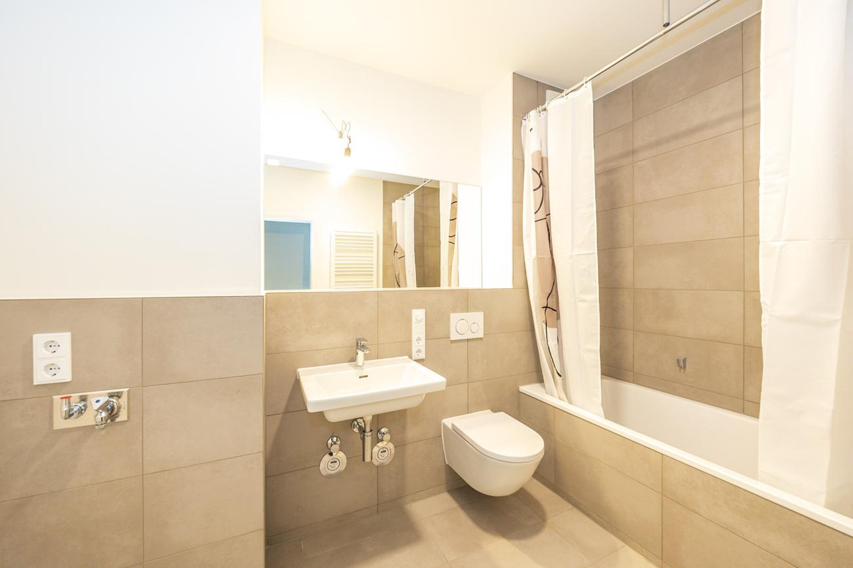 - Bäder mit Handtuchheizkörpern, großformatigen Fliesen und bodengleich gefliesten Duschen mit ESG-Glasabtrennungen