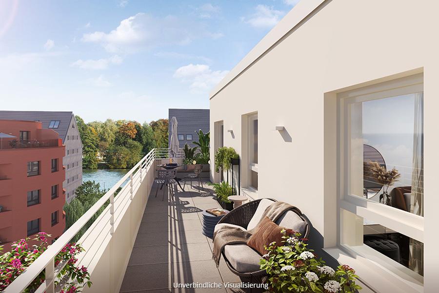 Alle Wohnungen verfügen über eine Loggia oder eine Terrasse – auf Wunsch auch mit Sicht auf die Havel. Immer inklusive ist der Blick auf die detailliert geplanten und liebevoll gestalteten Freianlagen mit viel Platz für Pflanzen und Stauden. Diese durchdachte Kombination aus erstklassigem Innen und naturnahem Außen schafft eine einzigartige Wohnatmosphäre mit hoher Authentizität.