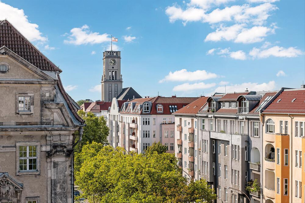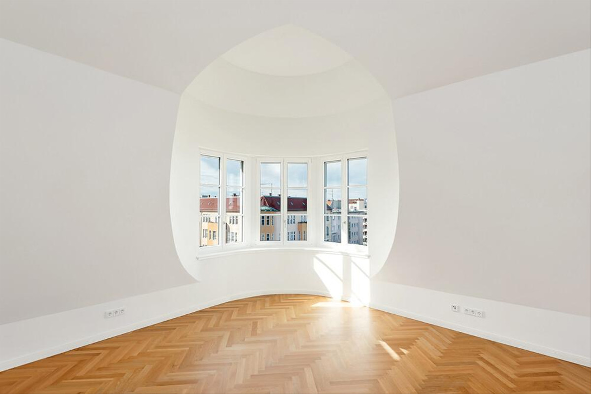 zeitgenössisch und schaffen ein kompromisslos hohes Wohnniveau. Zum Beispiel die großzügigen Eckfenster zur Ecke Martin-Luther- und Grunewaldstraße. Die Eckwohnung im Dachgeschoss wartet mit einem über 40 Quadratmeter großen, stilvollen Turmzimmer auf. Balkone, Wintergärten und Terrassen hingegen waren