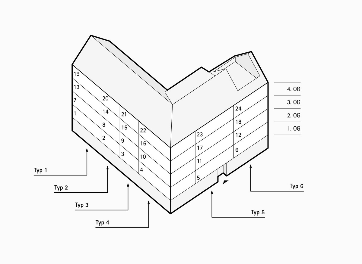 Das Gebäude verfügt über 4 Wohnetagen, sowie über einen Dachboden und ein Erdgeschoss. Über den Aufzug können alle Stockwerke erreicht werden. Die Fassaden sind Ausdruck einer modernen Haltung, ohne modisch zu sein. Wichtig sind uns gute Proportionen und Nutzbarkeit. Die straßenseitige Fassade fügt sich mit den homogenen Fensterformaten und eingerückten Loggien in die gründerzeitliche Nachbarbebauung ein. Die stärker aufgelockerte hofseitige Fassade interagiert über den Laubengang und die Balkone mit dem Freiraum. Zur Straße hin und teilweise zum Hof hin werden die Fenster mit Senkrechtmarkisen mit Ausstellfunktion ausgestattet.