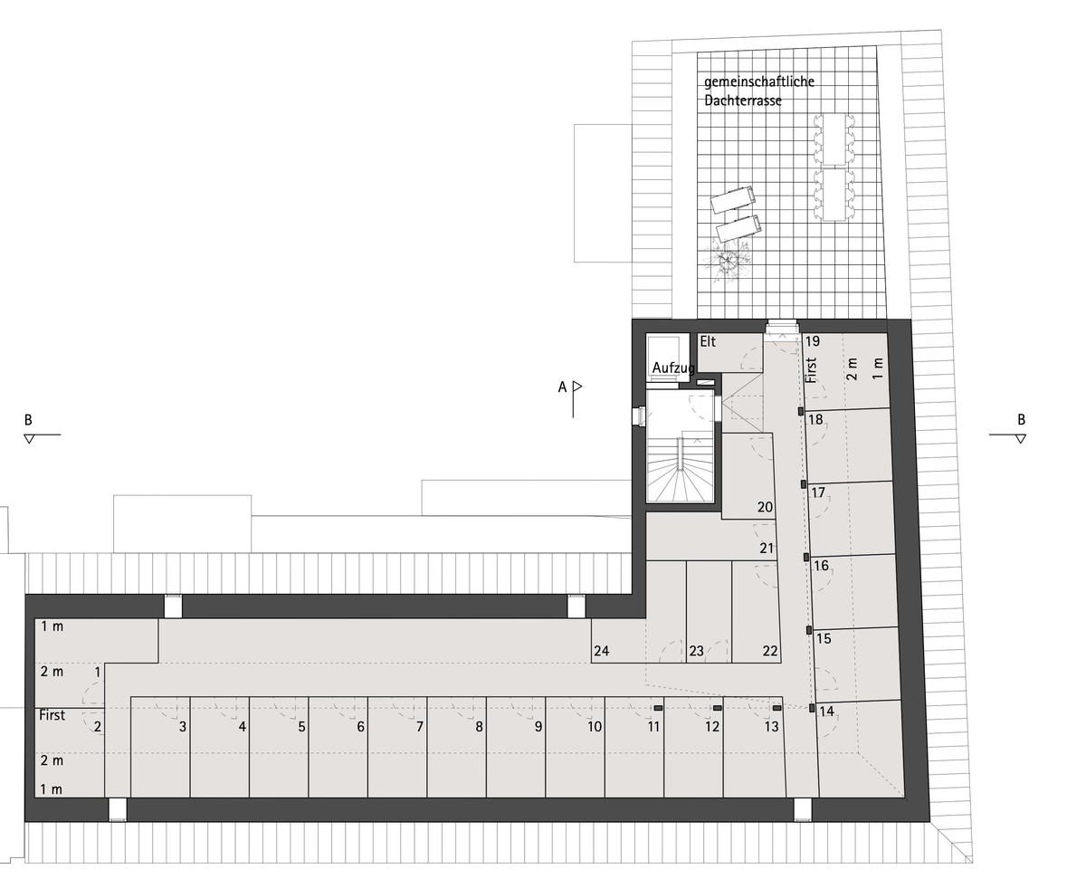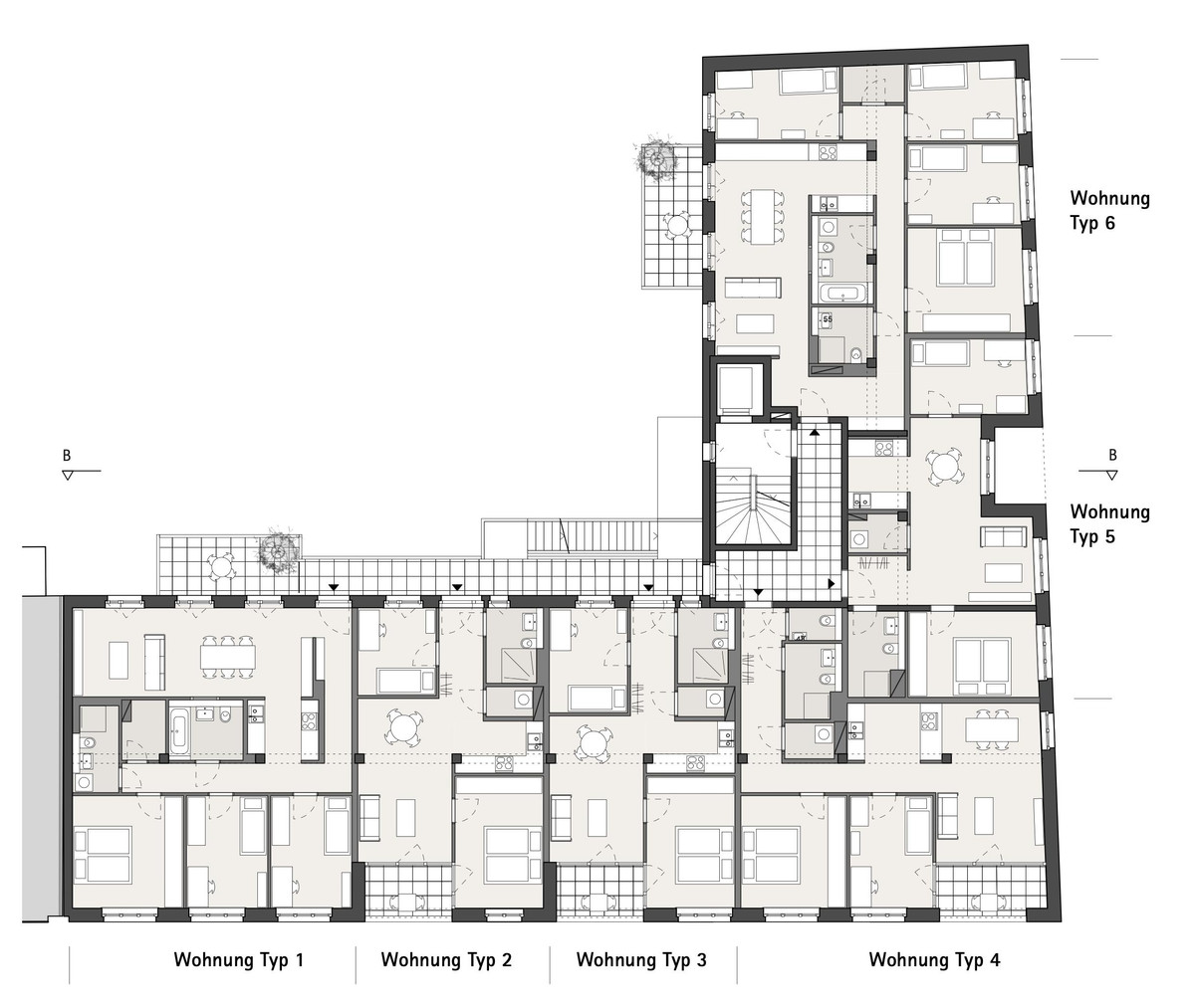 Die Wohnungsgrößen haben wir so angelegt, dass eine dynamische soziale Gemeinschaft entstehen kann. So finden Familien ebenso ein Zuhause wie Bewohner, die auf der Suche nach einer praktischen Wohnung für den Ruhestand sind. Treffpunkte für die Gemeinschaft sind der Garten und die Dachterrasse.