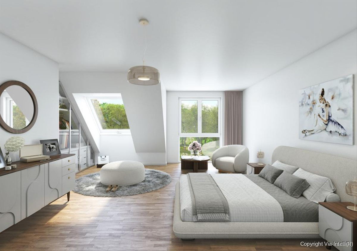 Das Dachgeschoss umfasst ein großzügiges Elternschlafzimmer und ein weiteres Zimmer mit lichtdurchfluteter Gaube, ideal als Gästezimmer, Kinderzimmer Homeoffice zu nutzen. Der Abstellraum kann optional in ein zusätzliches Badezimmer mit ebenerdiger Dusche umgebaut werden.