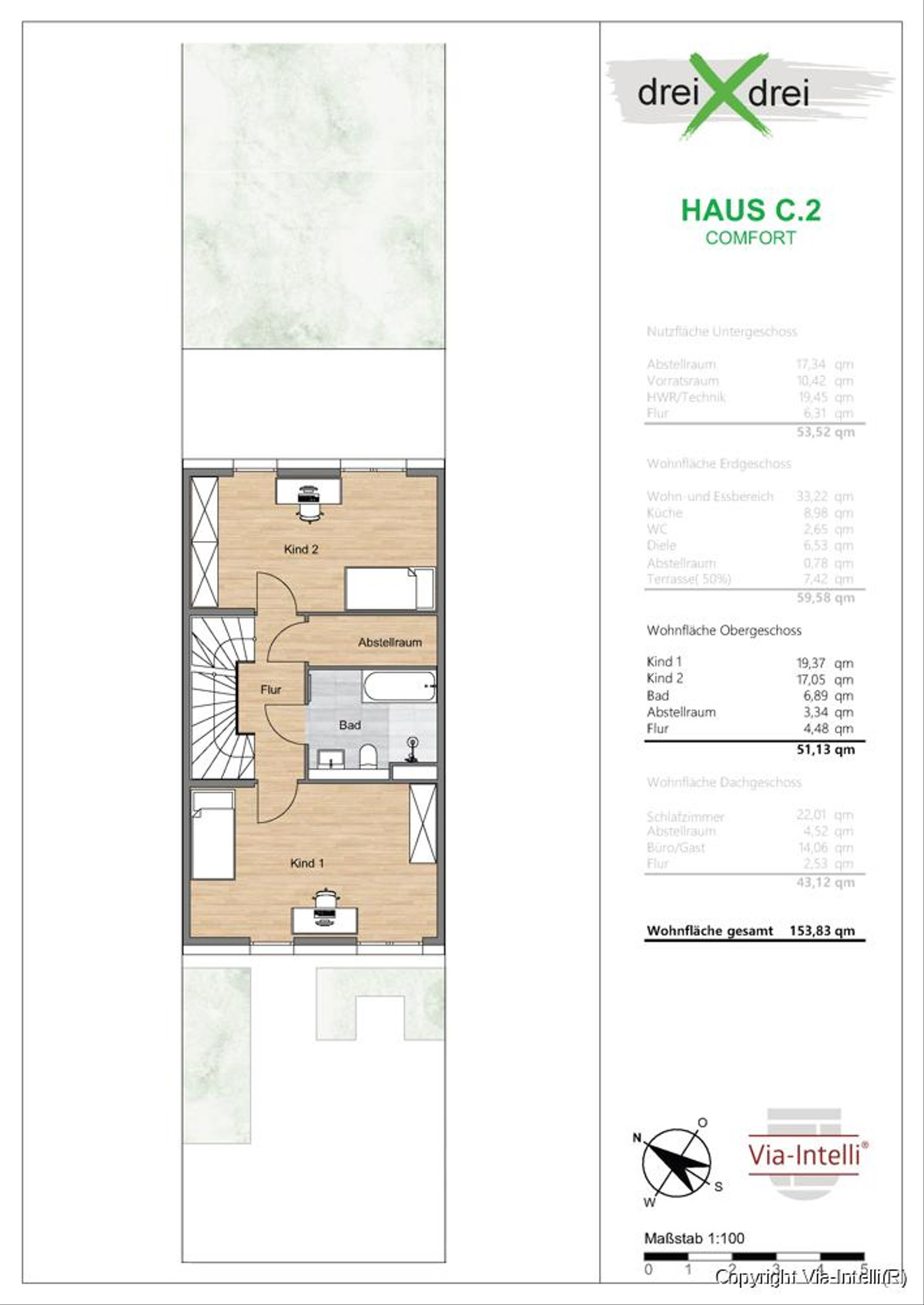 Im lichtdurchfluteten, offenen Wohnbereich auf über 42 m² können Sie entspannen und genießen. Die großzügige Terrasse und der Garten mit unverbaubarem Blick in den Wald bieten Ruhe und Erholung. Die Küchen-Elektroplanung wird kostenfrei nach Ihren Wünschen angepasst. Zudem haben Sie die Möglichkeit, Ihre Küche mit einer raumhohen Ganzglastür zu individualisieren. Ein Gäste-WC sowie ein Abstellraum runden die Planung des Erdgeschosses ab.