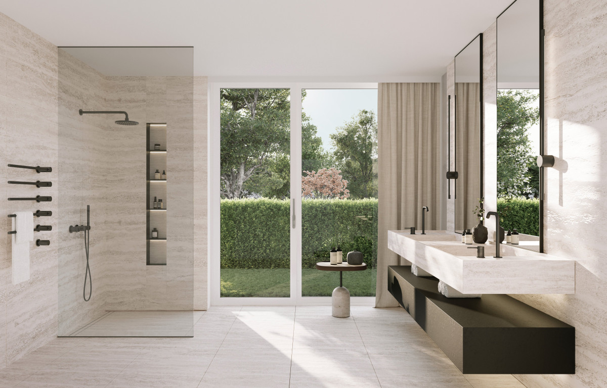 Die mit handwerklicher Präzision von erfahrenen Handwerkern ausgeführten traditionellen Putzvarianten, wie Kammzug und Besenstrich strukturieren die Kubatur und harmonieren mit dem kontrastreichen Bronzeton der bodentiefen Holz-Aluminium-Fenster, die in ihren Proportionen und Konstruktion auf eine ausgewogene Fassadengestaltung ausgerichtet sind. Die dezenten Vor- und Rücksprünge der Gesimse verleihen EDITION BH23 Leichtigkeit und architektonische Akzente.