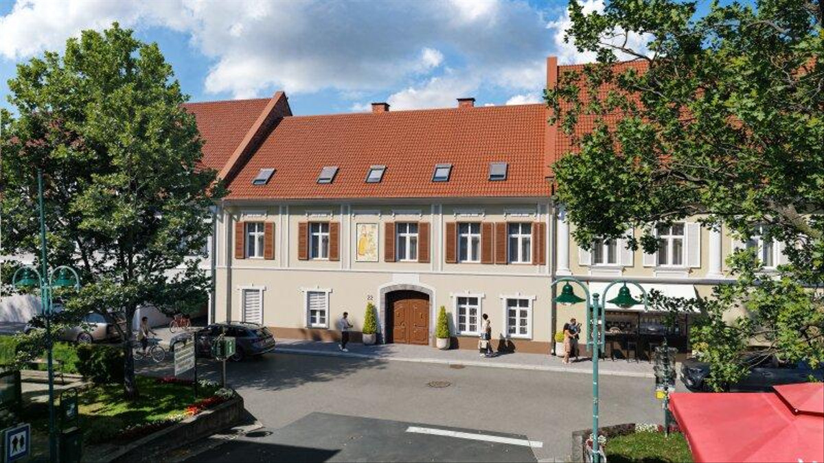 Ortzentrum von Eibiswald. Sämtliche Geschäfte des täglichen Bedarfs sowie Ärzt:innen und Apotheken befinden sich in Gehdistanz. Der nahegelegene Bahnhof sorgt für eine regelmäßige Anbindung an die Landeshauptstadt Graz.