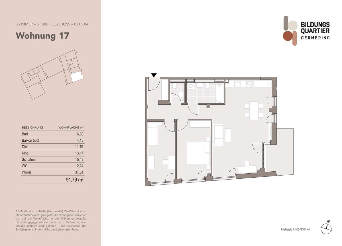 Den kommunikativen Mittelpunkt dieser Wohnung im 3. Obergeschoß des neuen "Bildungsquartiers Germering" bildet der über 37 Quadratmeter (!) große Wohnbereich, in den sich auch ein Arbeitsplatz für Home-Office o.ä. noch mühelos integrieren ließe. Ein Süd-Ost-Balkon lädt zu angenehmen Stunden im Freien ein.