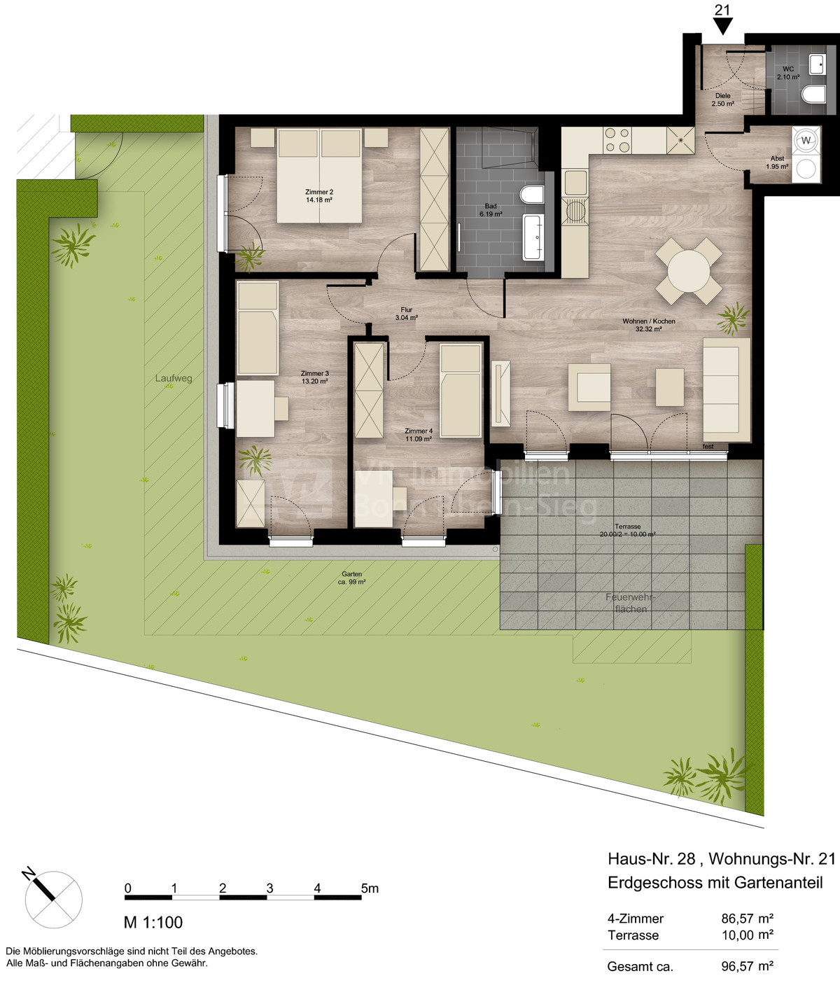 Diese 4-Zimmer-Gartenwohnung liegt im Erdgeschoss und bietet ca. 96,57 m² Wohnfläche. Der offen gestaltete Wohn-/Essbereich mit angrenzender Küche öffnet sich direkt zur Sonnenterrasse und dem großzügigen, privaten Gartenanteil mit ca. 99 m². Der Garten wird zur natürlichen Erweiterung des Wohnraums, ideal für lange Sommerabende, Spielen mit Kindern, Gärtnern oder einfach viel Platz zum Durchatmen.