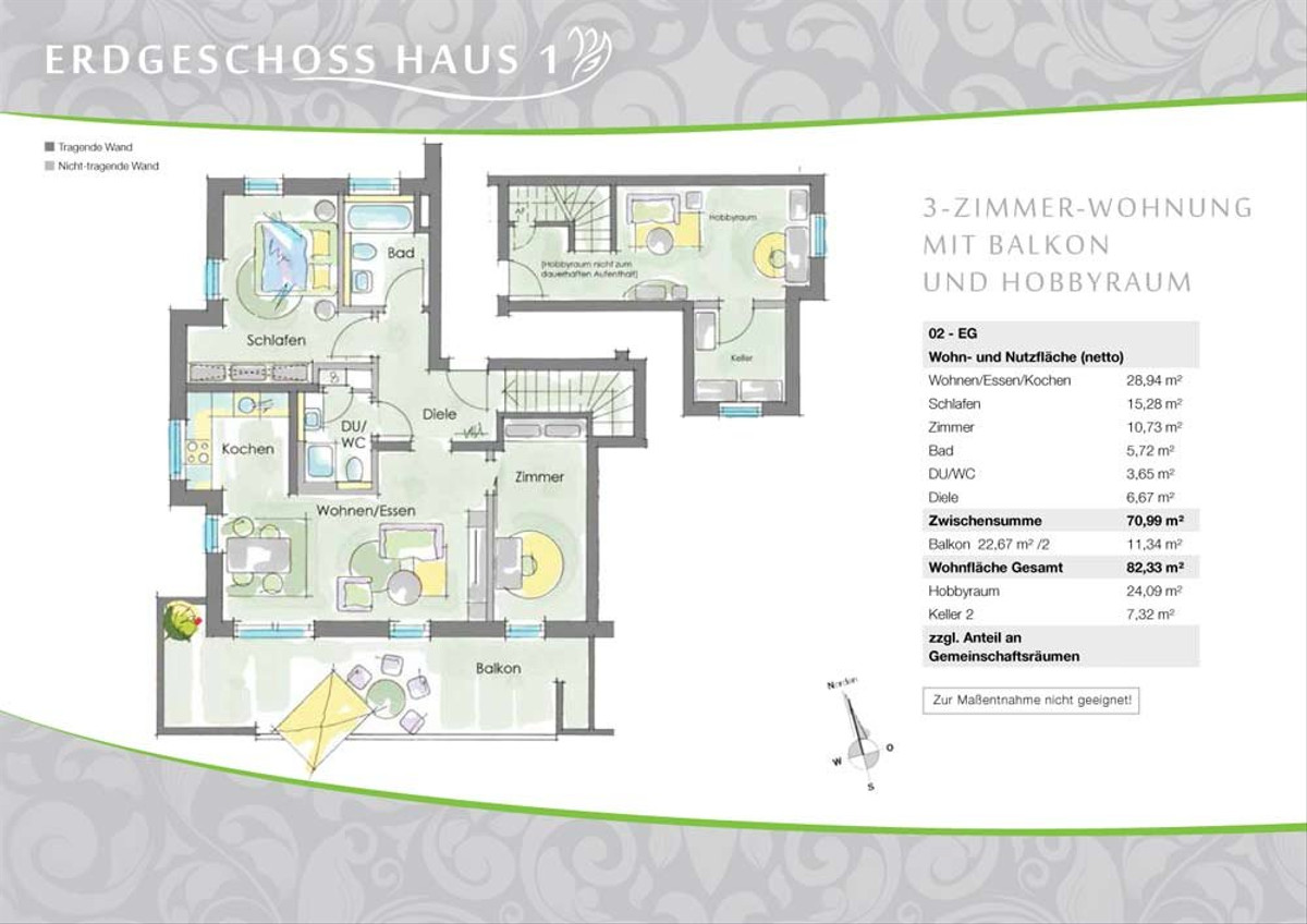 Die Grundrisse der 2- bis 5-Zimmer-Wohnungen lassen vielfältige Wohnvarianten zu. So stehen beispielsweise Wohnungen mit zusätzlichem Hobbyraum zur Auswahl. Außerdem können Sie sich auf riesige Sonnenbalkone mit einem weiten Blick ins Grüne freuen. Sollten Sie sich für eine Erdgeschoss-Wohnung entscheiden, erwartet Sie ein sonniger, südlich ausgerichteter Garten.