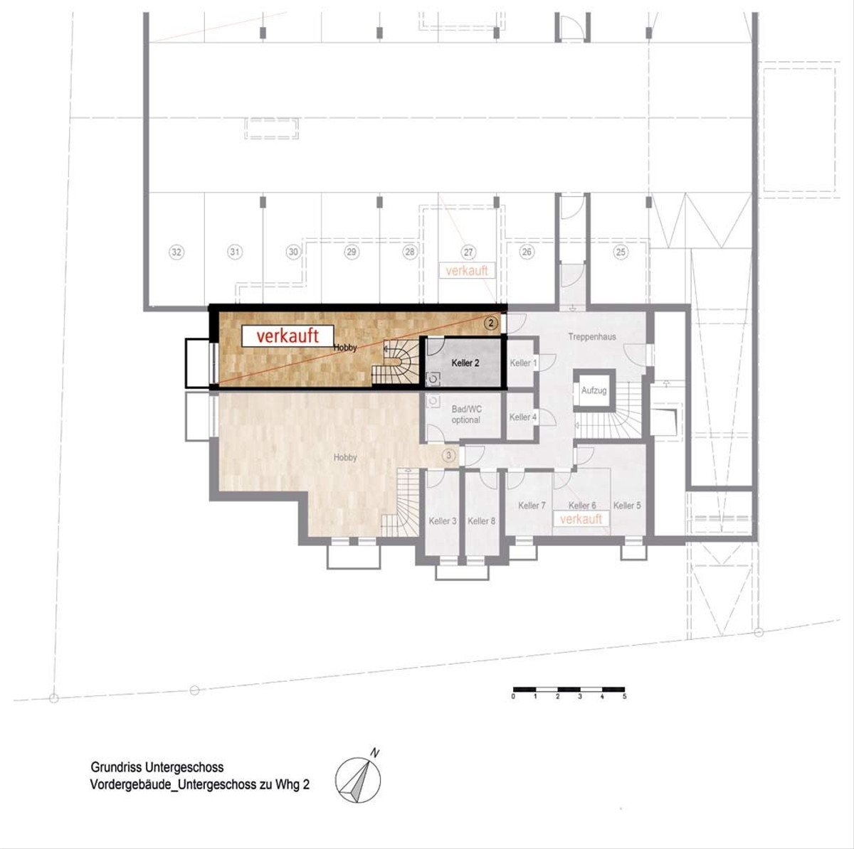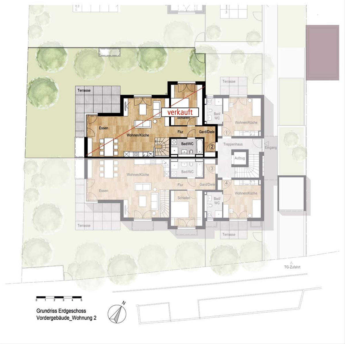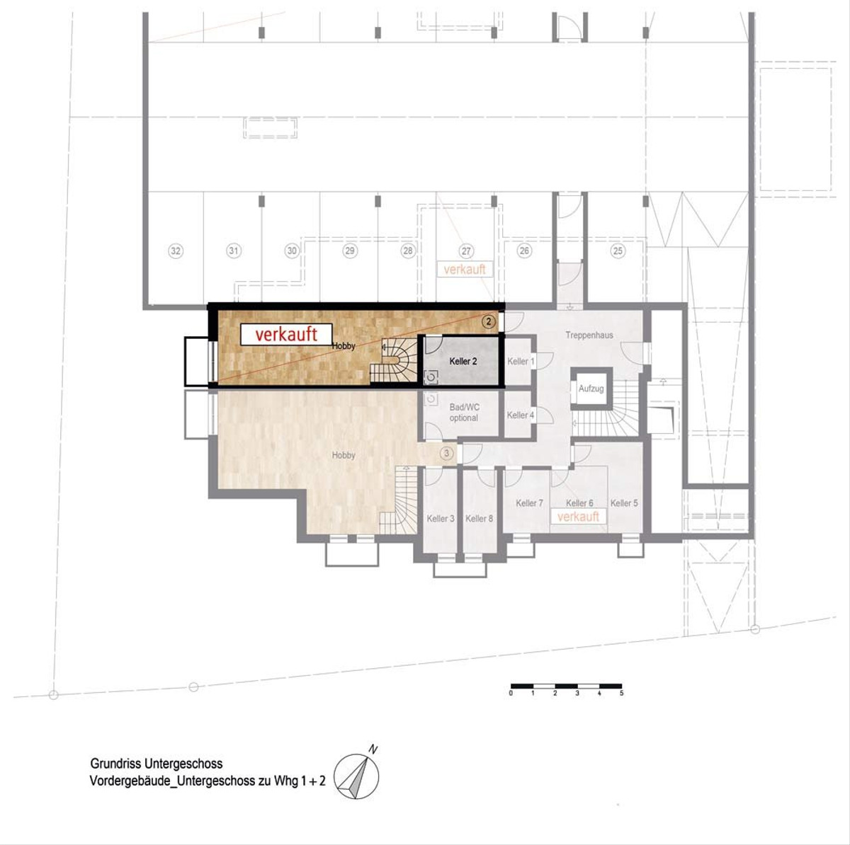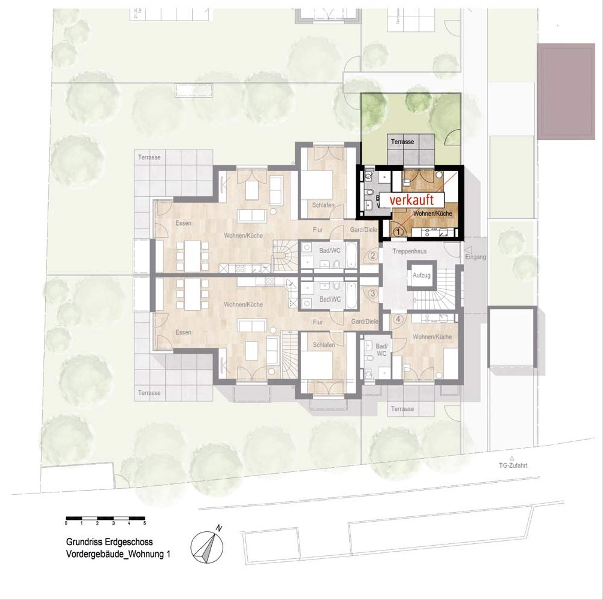 Zum Verkauf stehen die Wohnungen des Vordergebäudes mit Wohnflächen von ca. 104 bis ca. 140 m². Die Gebäude sind vorteilhaft nach Südwesten ausgerichtet. Der Bauherr hat besonderen Wert auf eine großzügige und variable Grundrissgestaltung gelegt. So entsteht individueller Wohnraum für Singles, Paare und Familien. Jeweils zwei Erdgeschosswohnungen sind über interne Treppen mit den dazugehörigen Hobby- und Kellerräumen des Untergeschosses verbunden. Im Erdgeschoss gibt es die Möglichkeit Wohnungen zusammen zu schließen. Alle Wohnungen der Obergeschosse erhalten einen privaten Freibereich in Form von Balkonen oder Dachterrassen mit südwestlicher Ausrichtung. Hohen Komfort bietet auch der Aufzug, der von der Tiefgarage bis zur zweiten Ebene des Dachgeschosses, dem Galeriegeschoss, fährt.