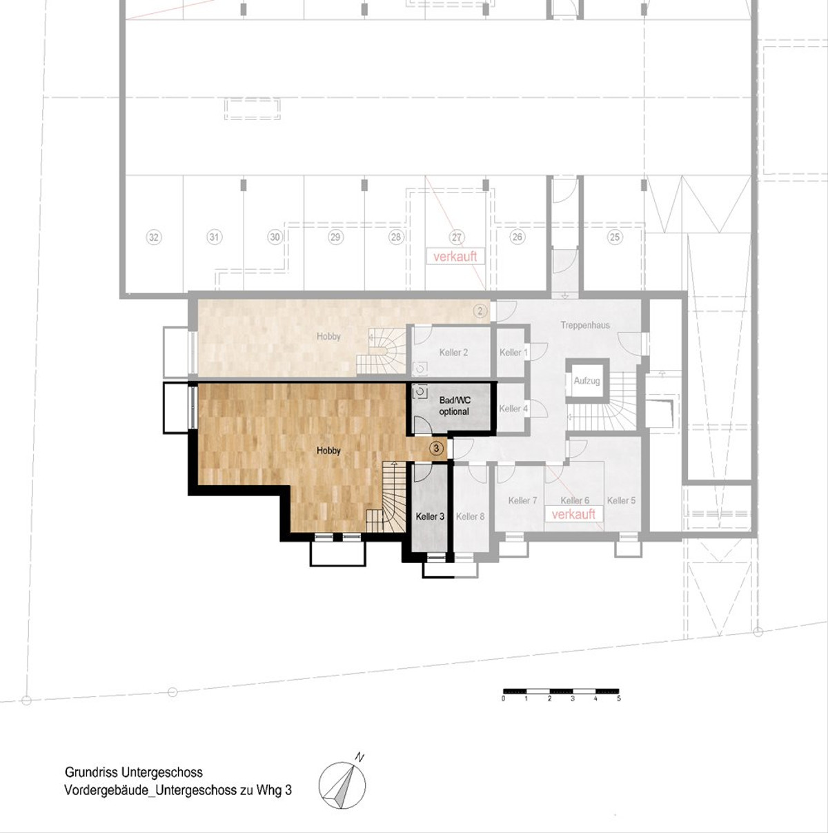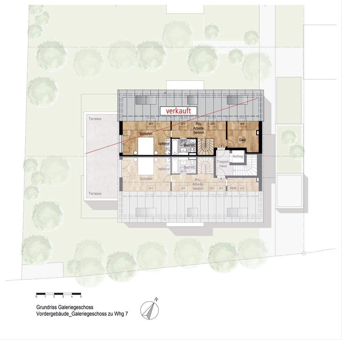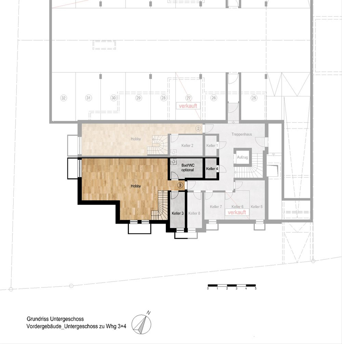 Zum Verkauf stehen die Wohnungen des Vordergebäudes mit Wohnflächen von ca. 104 bis ca. 140 m². Die Gebäude sind vorteilhaft nach Südwesten ausgerichtet. Der Bauherr hat besonderen Wert auf eine großzügige und variable Grundrissgestaltung gelegt. So entsteht individueller Wohnraum für Singles, Paare und Familien. Jeweils zwei Erdgeschosswohnungen sind über interne Treppen mit den dazugehörigen Hobby- und Kellerräumen des Untergeschosses verbunden. Im Erdgeschoss gibt es die Möglichkeit Wohnungen zusammen zu schließen. Alle Wohnungen der Obergeschosse erhalten einen privaten Freibereich in Form von Balkonen oder Dachterrassen mit südwestlicher Ausrichtung. Hohen Komfort bietet auch der Aufzug, der von der Tiefgarage bis zur zweiten Ebene des Dachgeschosses, dem Galeriegeschoss, fährt.