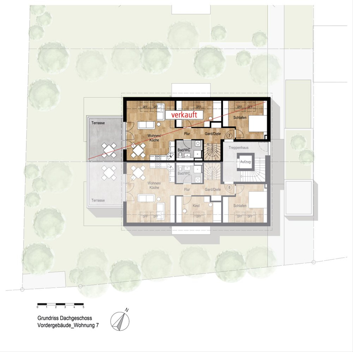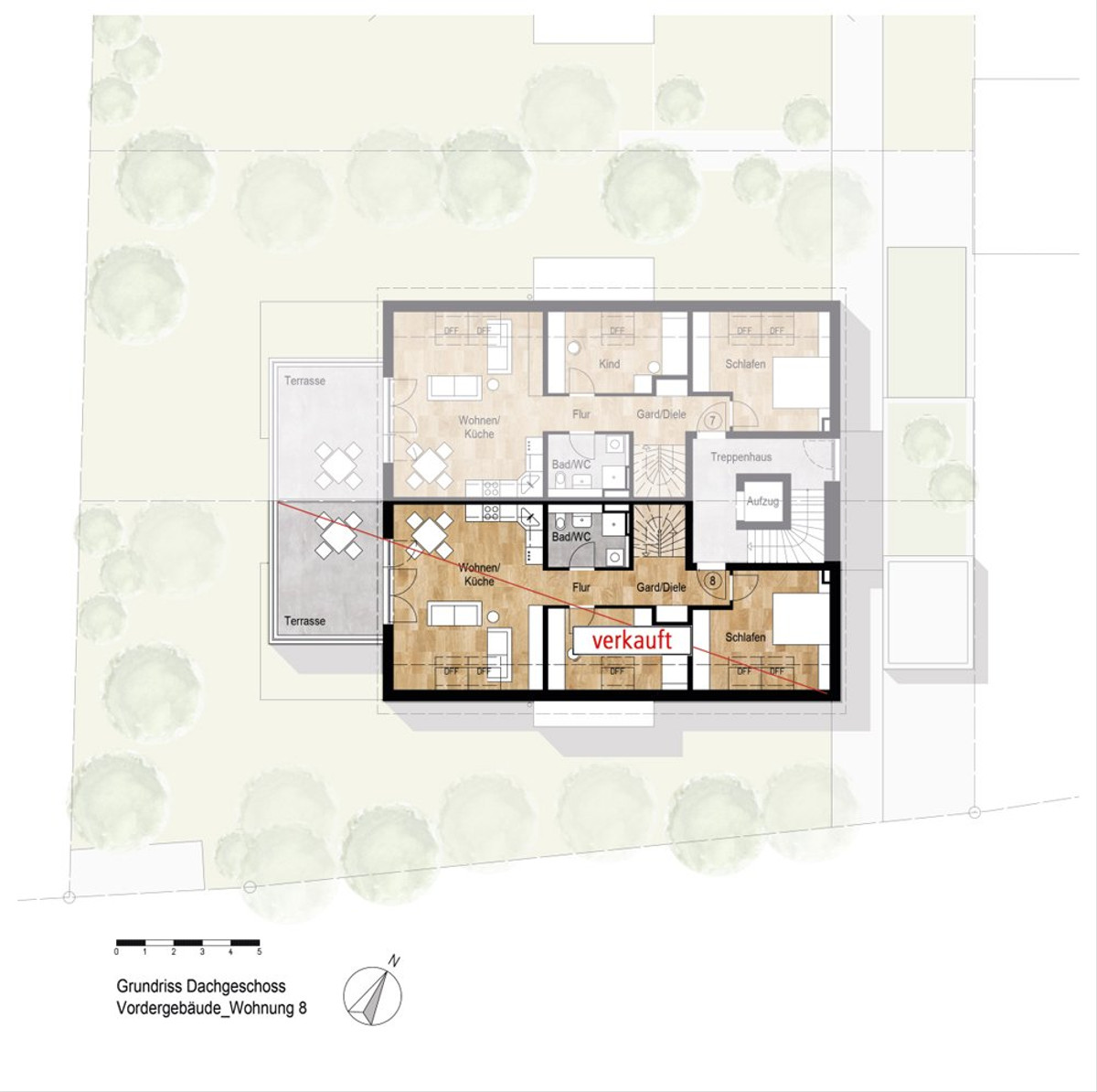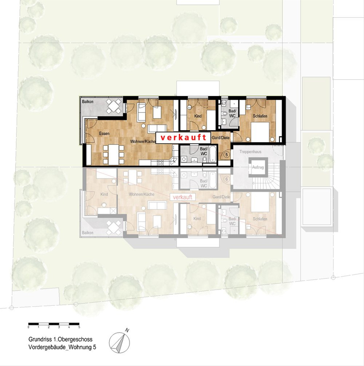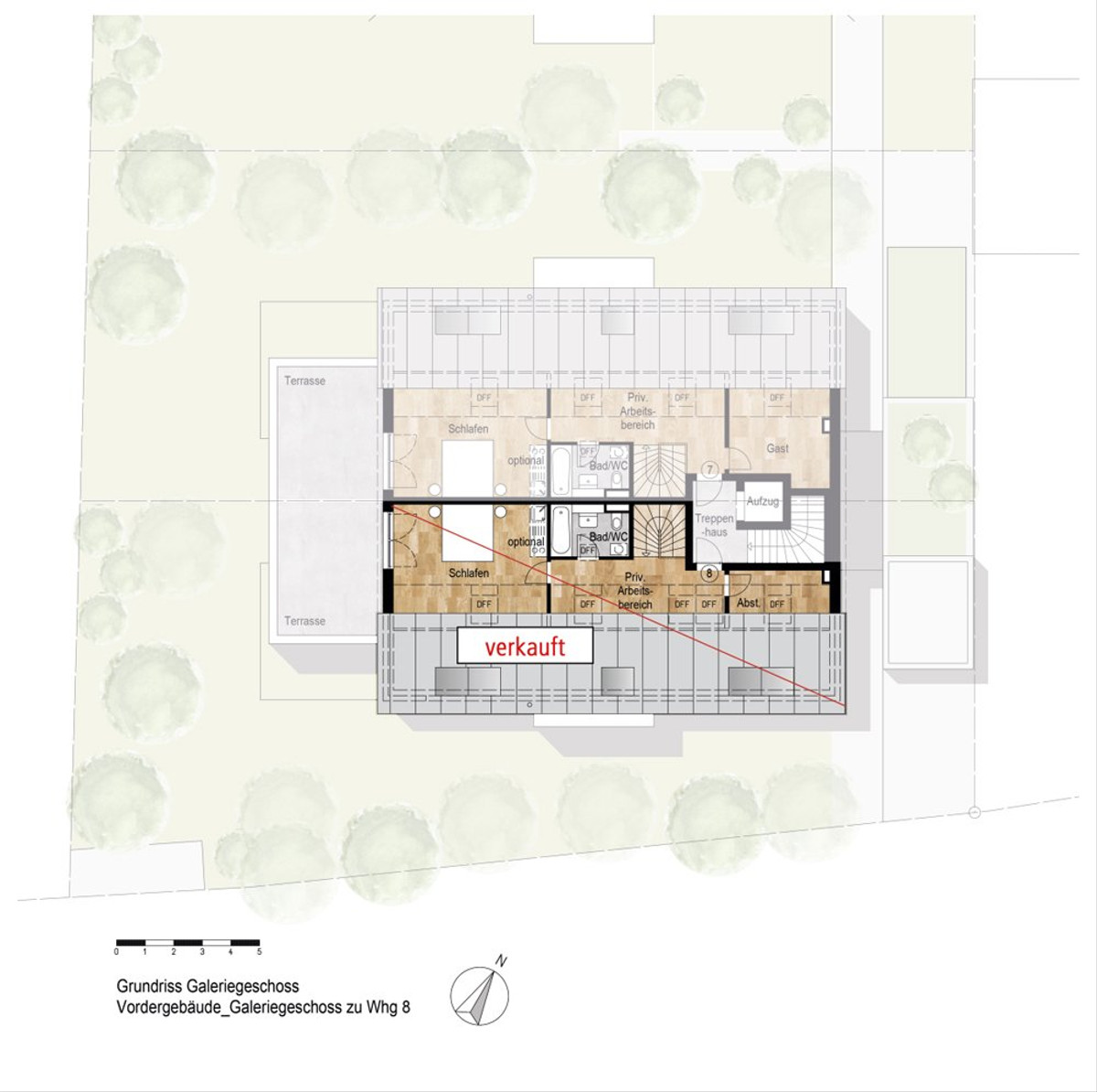 Zum Verkauf stehen die Wohnungen des Vordergebäudes mit Wohnflächen von ca. 104 bis ca. 140 m². Die Gebäude sind vorteilhaft nach Südwesten ausgerichtet. Der Bauherr hat besonderen Wert auf eine großzügige und variable Grundrissgestaltung gelegt. So entsteht individueller Wohnraum für Singles, Paare und Familien. Jeweils zwei Erdgeschosswohnungen sind über interne Treppen mit den dazugehörigen Hobby- und Kellerräumen des Untergeschosses verbunden. Im Erdgeschoss gibt es die Möglichkeit Wohnungen zusammen zu schließen. Alle Wohnungen der Obergeschosse erhalten einen privaten Freibereich in Form von Balkonen oder Dachterrassen mit südwestlicher Ausrichtung. Hohen Komfort bietet auch der Aufzug, der von der Tiefgarage bis zur zweiten Ebene des Dachgeschosses, dem Galeriegeschoss, fährt.