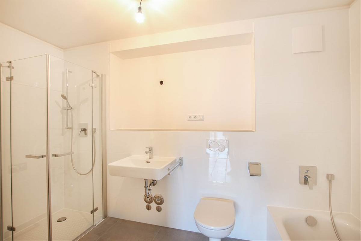 - Badezimmer: Marken-Sanitärgegenstande, Kristallglasspiegel, wandhängendes Tiefspül-WC-Becken mit Unterputzspülkasten, Handtuchwärmekörper, Stahlblechduschwanne mit Unterputzeinhebelarmatur, Brausegarnitur mit Stange