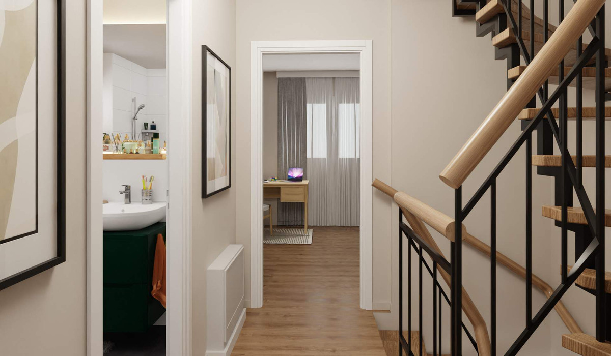 Dieses Reihenhaus überzeugt durch einen offenen und hellen Wohnbereich im Erdgeschoss, der direkt auf die Terrasse führt. Ideal für entspannte Stunden im Freien. Eine offene Küche, die zum Kochen und Genießen einlädt, sowie ein praktisches Gäste-WC runden das Erdgeschoss ab. Im Obergeschoss erwarten Sie zwei gemütliche Schlafzimmer und ein modernes Badezimmer mit bodengleicher Dusche. Ihr neuer Lieblingsraum: Das großzügige Schlafzimmer im Dachgeschoss. Gleich nebenan bietet Ihnen ein zusätzliches Zimmer weitere Nutzungsmöglichkeiten.