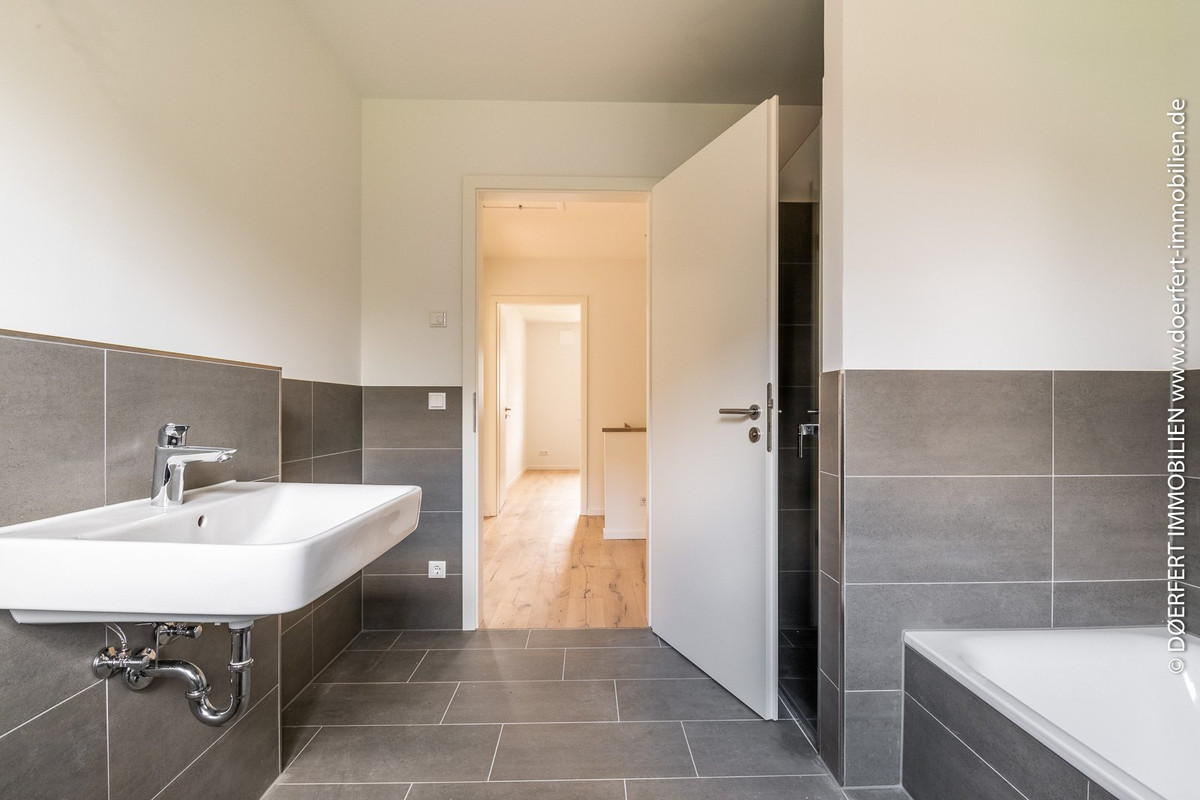 - Das hochwertige Vollbad verfügt über eine eingelassene Wanne und eine barrierefreie große Dusche für ein entspannendes Wellness-Erlebnis.