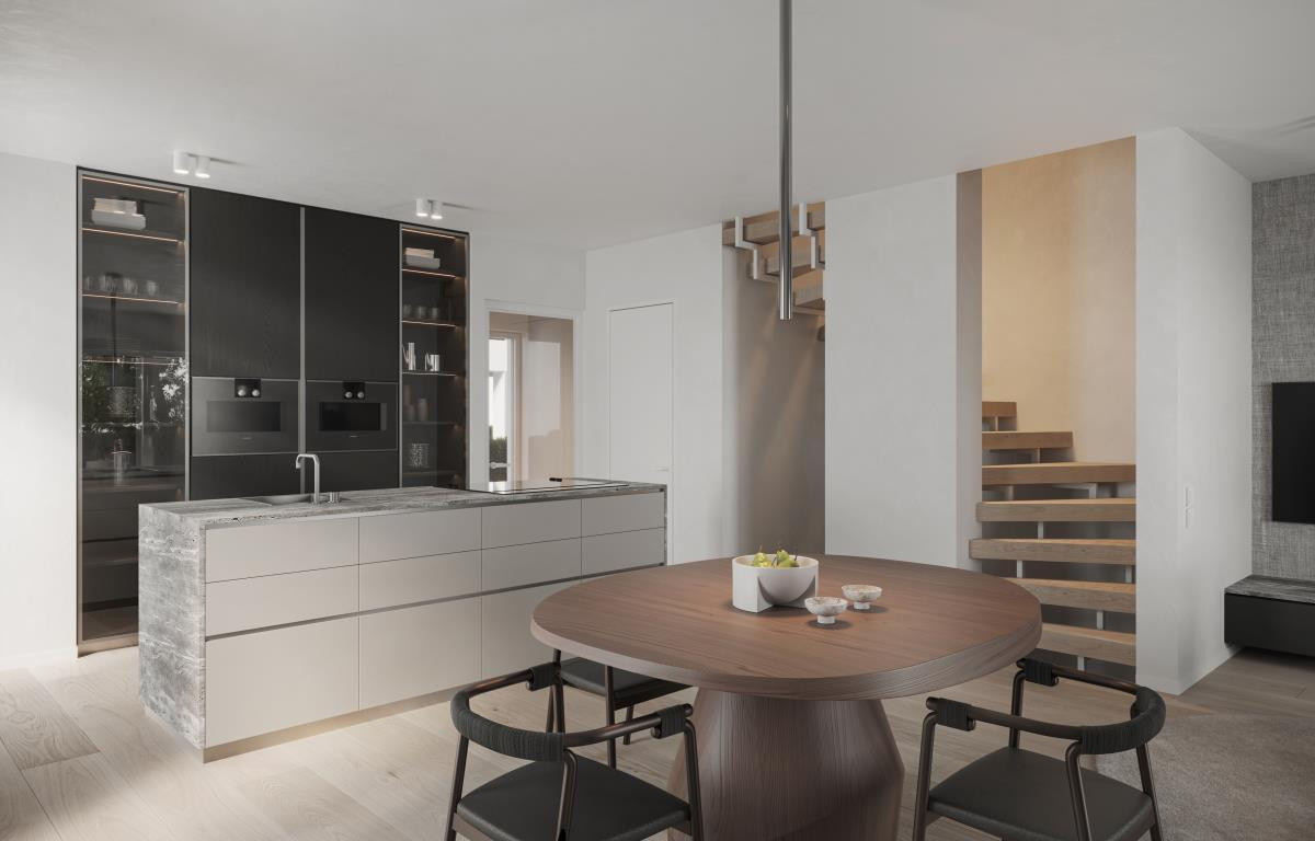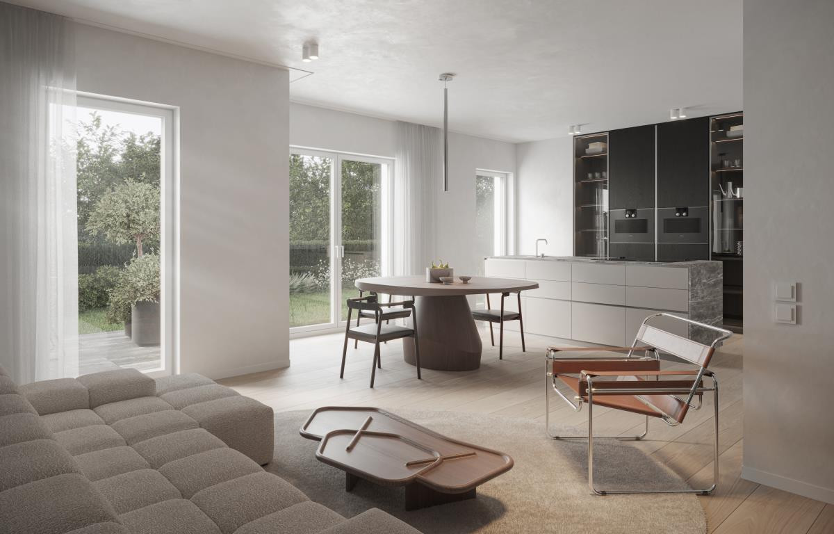 Die beeindruckenden Wohn-Ess-Bereiche mit integrierten Küchen in den Erdgeschossen der Häuser sind behagliche Bühnen für den Alltag. Faktoren wie Helligkeit und Größe sorgen dafür, dass der Funke sofort überspringt, wenn man sie betritt. Verstärkt wird dieses Gefühl noch durch die direkten Zugänge zu den Sonnenterrassen und Gärten. So entsteht eine einmalige Verbindung von Innen und Außen, die unzähligen Möglichkeiten für die Gestaltung des täglichen Daseins bietet.