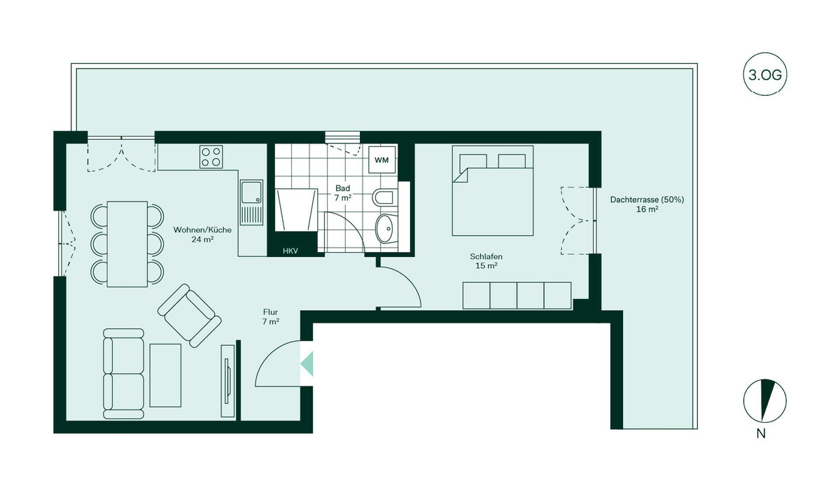 Herzlich willkommen in Ihrer neuen Eigentumswohnung. Beim Betreten empfängt Sie ein einladender Flur, der in den Wohnbereich mit integrierter Küche führt. Hier finden Sie Platz für gemeinsame Mahlzeiten und entspannte Abende. Das geräumige Schlafzimmer bietet Raum für Erholung und Ruhe. Ihr modernes Bad mit bodengleicher Dusche ist modern ausgestattet. Das Highlight ist die großzügige Dachterrasse, wie gemacht zum Entspannen und die Aussicht genießen.