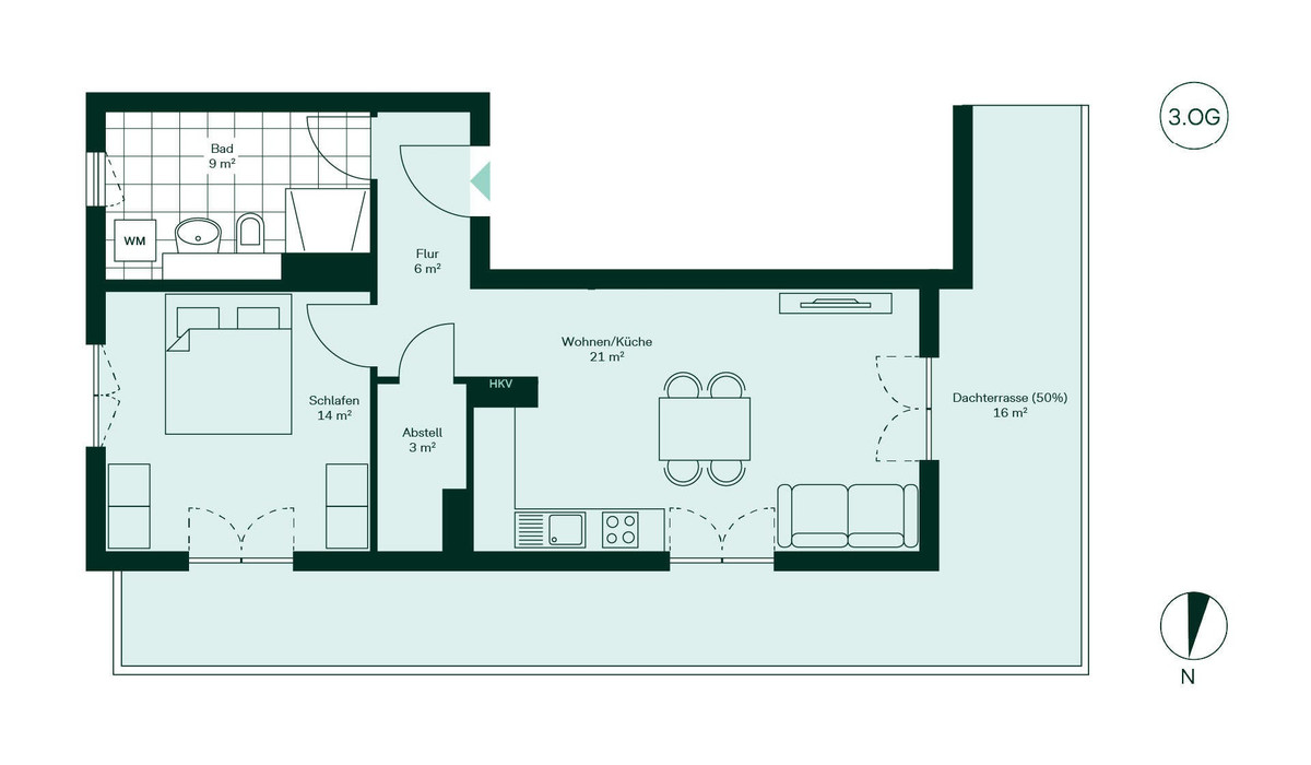 Willkommen in Ihrem neuen Zuhause. Sie betreten die Wohnung durch den einladenden Flur, der direkt in den hellen Wohn- und Küchenbereich führt. Hier finden Sie ausreichend Platz für gemütliche Abende mit Freunden. Die offene Küche lädt zum gemeinsamen Kochen ein. Das Schlafzimmer bietet einen ruhigen Rückzugsort für erholsame Nächte. Im praktischen Abstellraum können Sie Ihre persönlichen Dinge verstauen. Ein modernes Badezimmer mit bodengleicher Dusche rundet das Angebot ab. Die Dachterrasse ist der perfekte Ort, um die Sonne zu genießen und den Tag ausklingen zu lassen.