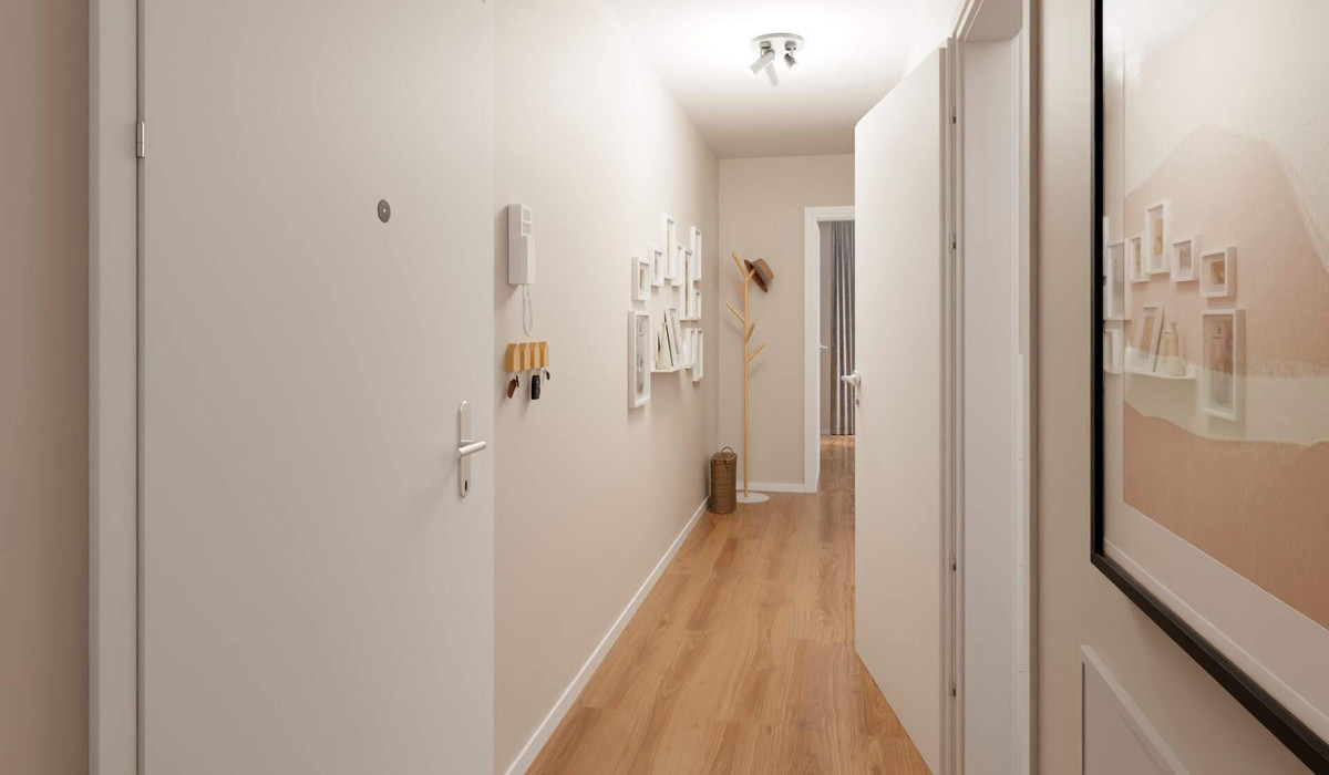 Treten Sie ein in diese moderne Wohnung und erleben Sie, wie der Flur zu einem praktischen Abstellraum und einem einladenden Wohnbereich führt. Die Küche ist offen gestaltet und bietet viel Platz für gesellige Abende. Zwei Balkone laden zum Entspannen ein und bieten einen herrlichen Ausblick. Das Schlafzimmer ist großzügig und ruhig gelegen. Ein weiteres Zimmer eignet sich ideal als Kinderzimmer oder Homeoffice. Das Badezimmer ist komfortabel ausgestattet. Genießen Sie die Vorzüge eines durchdachten Grundrisses und das Gefühl von Geborgenheit.