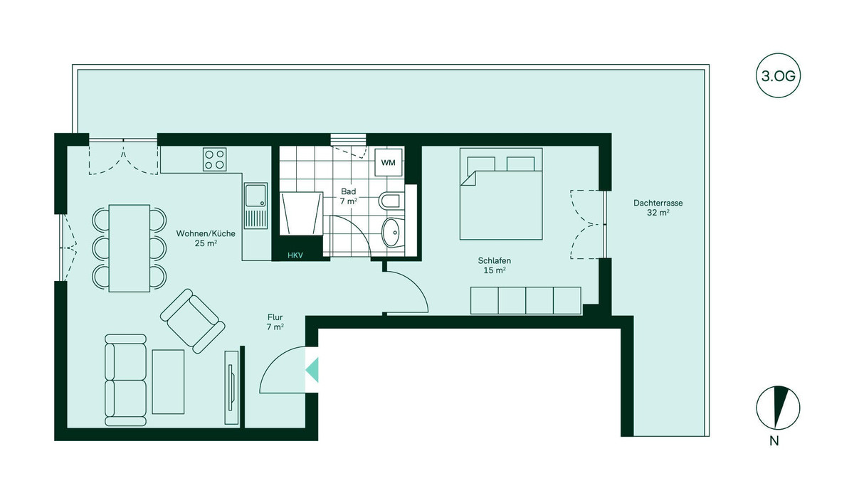 Über den Flur gelangen Sie direkt in den offenen Wohnbereich – ideal für gemütliche Abende und gemeinsame Mahlzeiten. Die angrenzende Dachterrasse lädt dazu ein, draußen zu frühstücken oder einfach den Blick schweifen zu lassen. Das Schlafzimmer bietet Ruhe und direkten Zugang ins Freie. Im Tageslichtbad beginnt Ihr Tag komfortabel – mit einer bodengleichen Dusche und angenehmer Helligkeit.