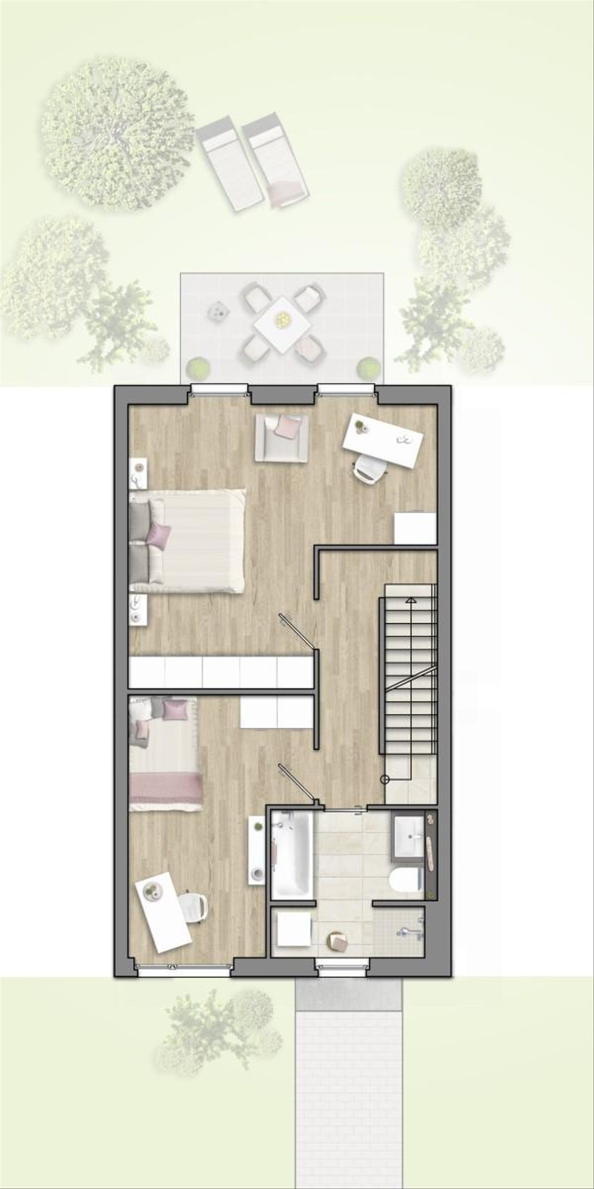 In der Gebgernstraße entstehen Einfamilienhäuser vom Haustyp L mit 129 m² Wohnfläche. Jedes Haus ist mit Fußbodenheizung und fortschrittlichen Smarthome-Funktionen ausgestattet. Das Besondere: Inmitten der einzigartigen Nahe-Landschaft mit ihren zahlreichen Weinhängen lebt man mit viel Natur vor der Tür. Es ist ein ideales Zuhause für alle Familien und Paare, die sich ein perfekt geschnittenes Haus mit eigenem Garten wünschen und zugleich Wert auf eine gute Nachbarschaft legen. Auch Kinder werden hier schnell Anschluss finden. Der nächste Spielplatz liegt nur 200 m von der Gebgernstraße entfernt.