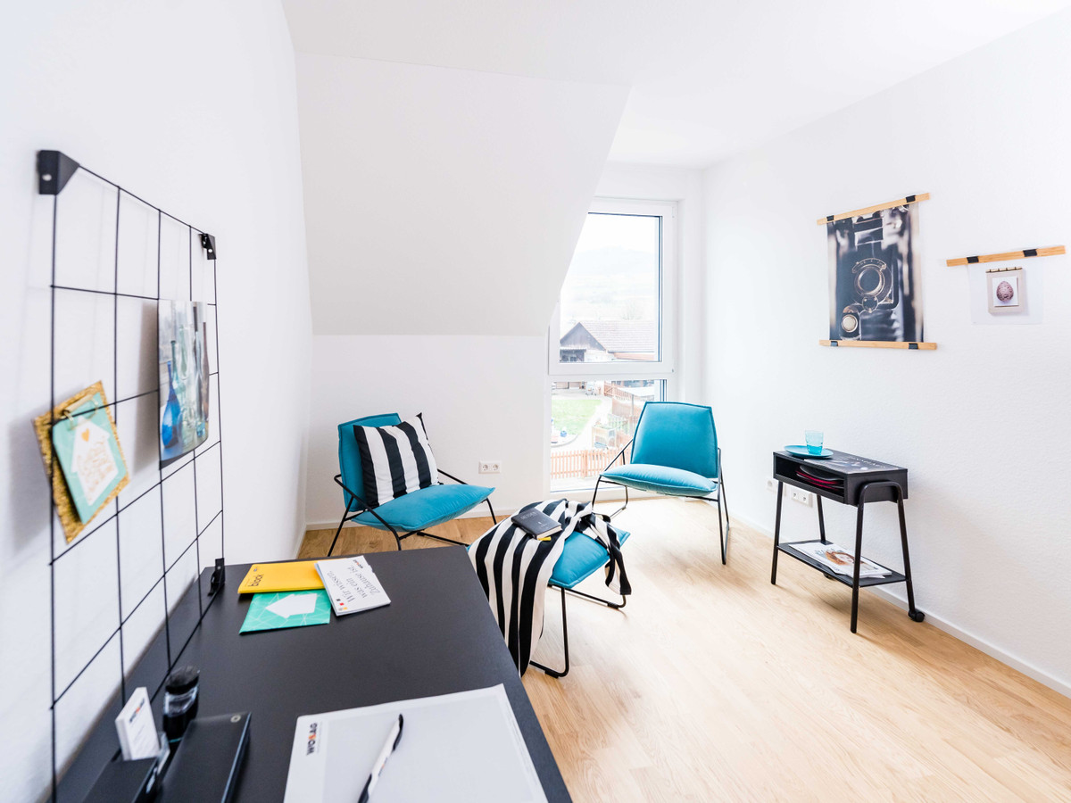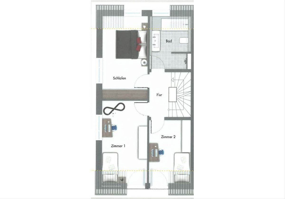 Die Modernität der äußeren Gestaltung setzt sich im Innern konsequent fort: zeitgemäße, offene und dennoch familientaugliche Grundrisse vermitteln auf etwa 122 m² Wohnfläche das Gefühl von Behaglichkeit. Das Erdgeschoss als Herz des Gebäudes bietet einen hellen Wohnbereich mit offener Küche. Im Obergeschoss finden sich die privaten Rückzugsräume für die ganze Familie, sowie das Badezimmer. Der nicht ausgebaute, als Speicher nutzbare Dachspitz bietet neben den Abstellräumen im Keller weitere Staufläche.