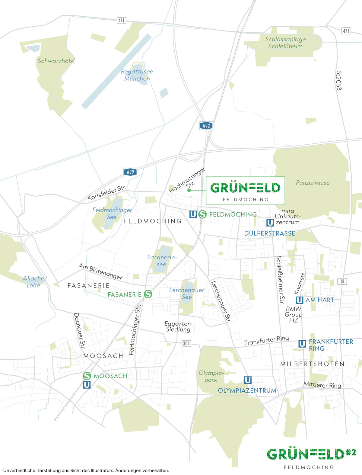 Eine Fahrt mit der S-Bahn in die Innenstadt führt entlang an Gartensiedlungen, am Fasaneriesee, am Nymphenburger Schlosspark und am Hirschgarten. Wer sich hingegen für das Rad entscheidet, kommt am Lerchenauer See vorbei und durchquert den Olympiapark. So oder so bieten sich Eindrücke und Ausblicke, die zeigen: Die Lage von GRÜNFELD schenkt jeden Tag echten Mehr-Erlebniswert.