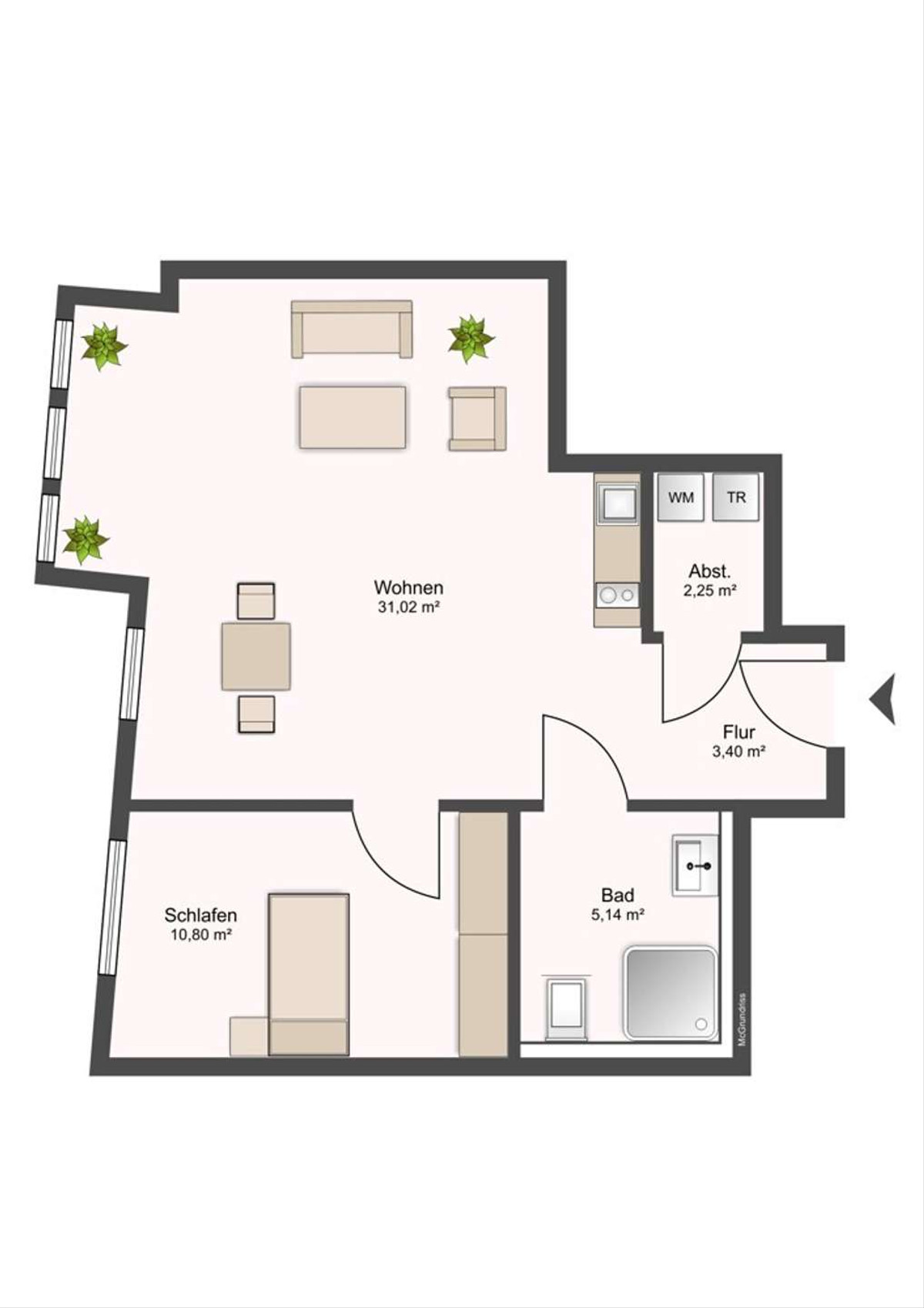 Der dargestellte Grundriss ist nicht maßstabgerecht und dient nur als Einrichtungsvorschlag. Maßgeblich sind die Angaben im Kaufvertrag.
