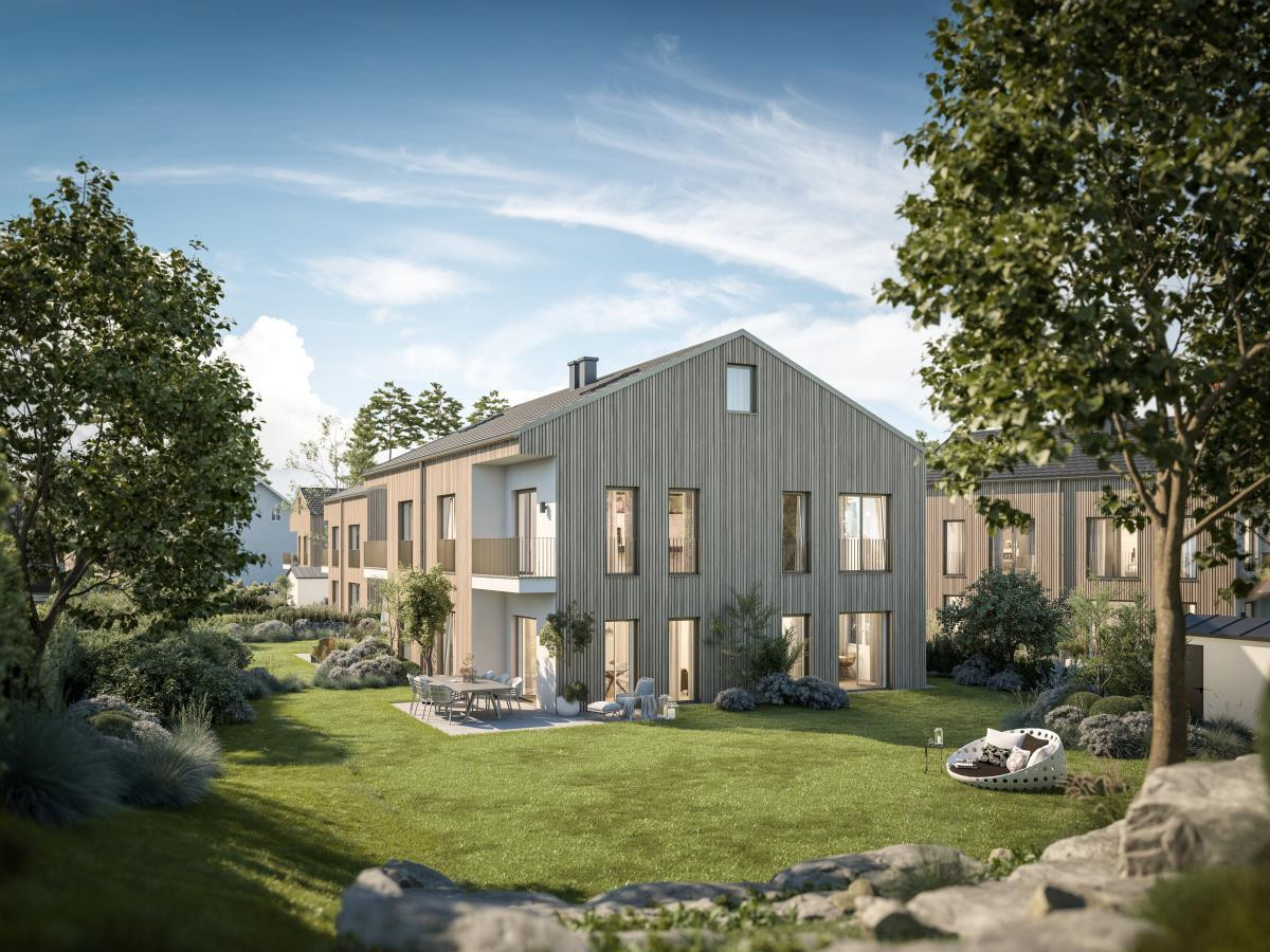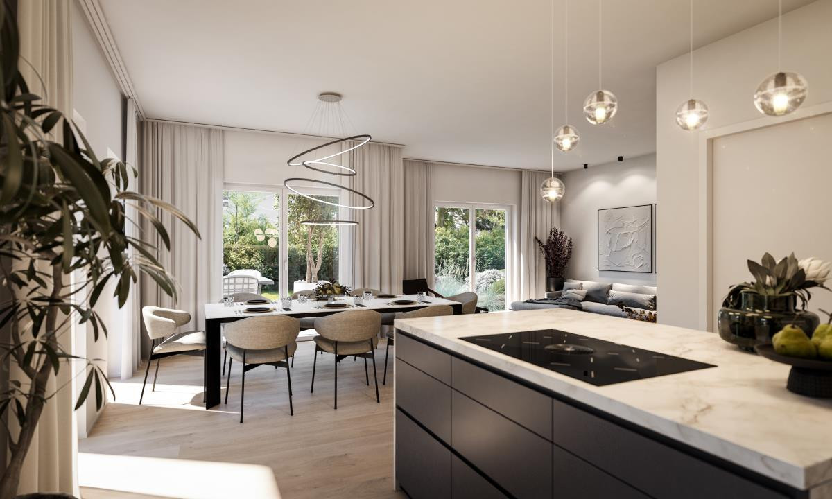 Die Erdgeschosse sind lichtdurchflutet und begeistern durch sehr große Wohn-Ess-Bereiche und offene Küchen. Alles ist hier im Fluss, alles greift perfekt ineinander. Nur wenige Schritte und schon ist man auf den herrlichen Sonnenterrassen und in den idyllischen Gärten um die Häuser. Die zeitlos elegante Ausstattung tut ihr Übriges dazu, aus den Räumen wahre Traumwelten zu machen.