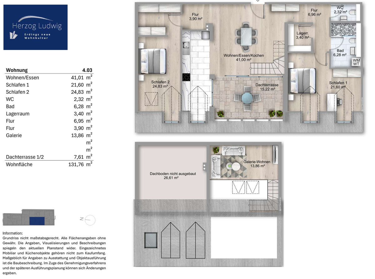 Panoramablick inklusive – in den Dachgeschosswohnungen steht man über den Dingen und genießt neben viel Freiraum auf der privaten Dachterrasse einen herrlichen Ausblick über die Dächer der Erdinger Innenstadt. Hier finden Sie, was Sie suchen: Eine urbane Wohnlage und modernen Wohnkomfort mitten in der ebenso lebenswerten wie weltoffenen Stadt Erding. Im HERZOG LUDWIG fühlt man sich „dahoam“: Ob als Zweit- oder Stadtwohnung, zum Selbstbezug oder zur Vermietung, ob chices Apartment oder geräumiges Leben unterm Dach – hier heißt Sie jede Wohnung mit viel Charme, Leichtigkeit und Wohlfühl-Atmosphäre willkommen.