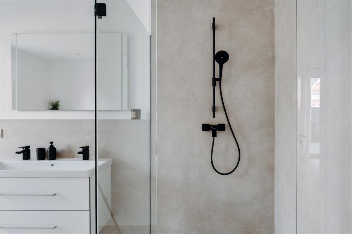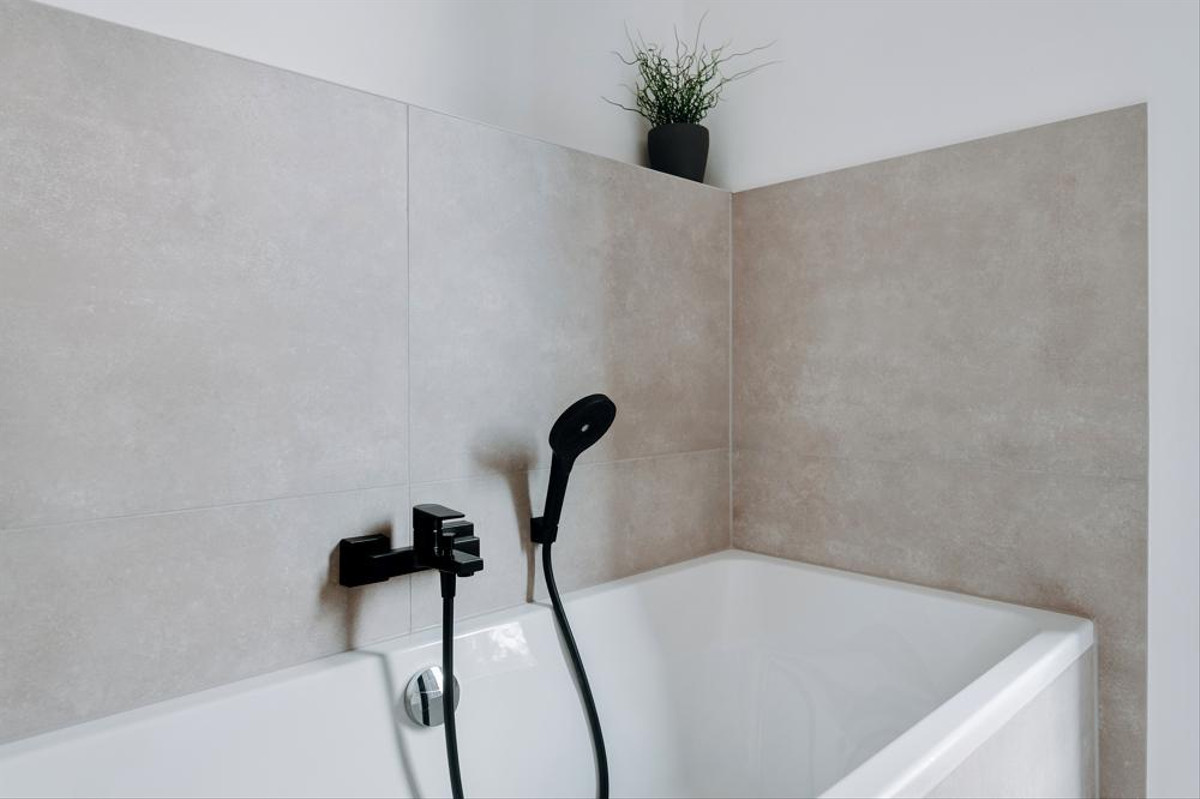 Barrierefreies Badezimmer mit großer Dusche, Badewanne, stilvollen Fliesen und Tageslicht