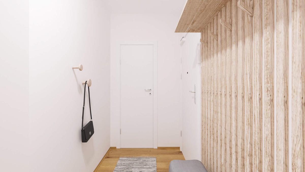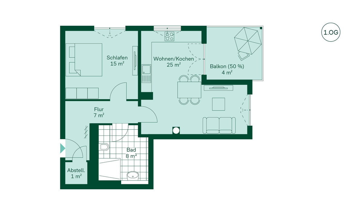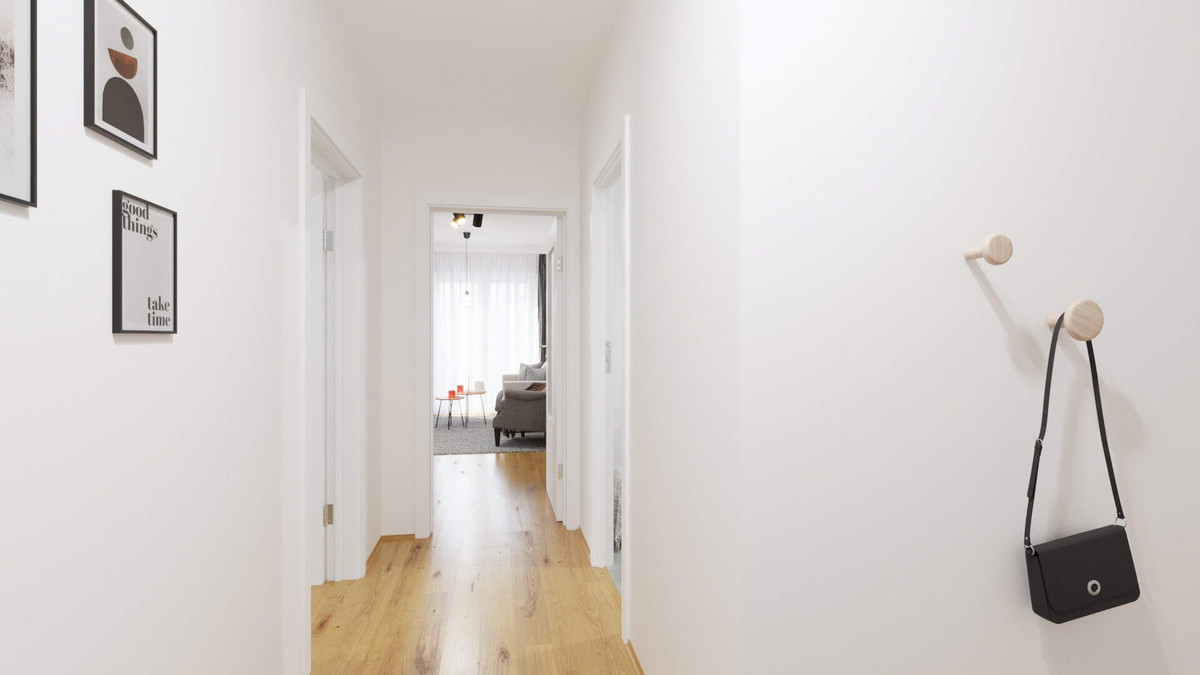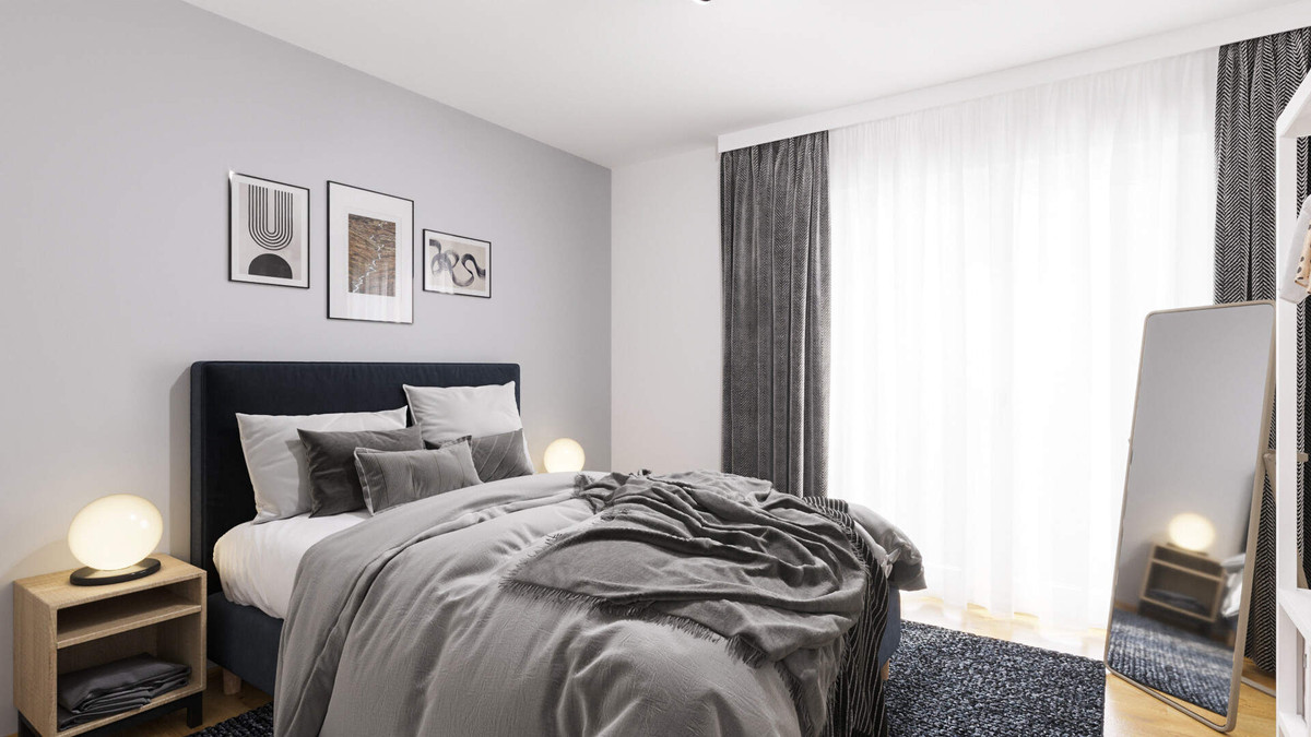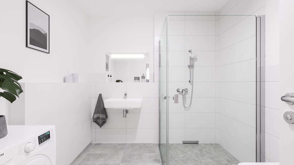 Beim Betreten der Wohnung gelangen Ihre Mieter in den Flur, der durch eine Garderobe und einen nützlichen Abstellraum stets sauber und ordentlich wirkt. Weiter geht es ins Schlafzimmer, das durch bodentiefe Fenster erhellt wird und genügend Platz für Bett und Möblierung bietet. Direkt gegenüber befindet sich das Bad, in dem sich die Morgenroutine dank bodengleicher Dusche bequem durchführen lässt.