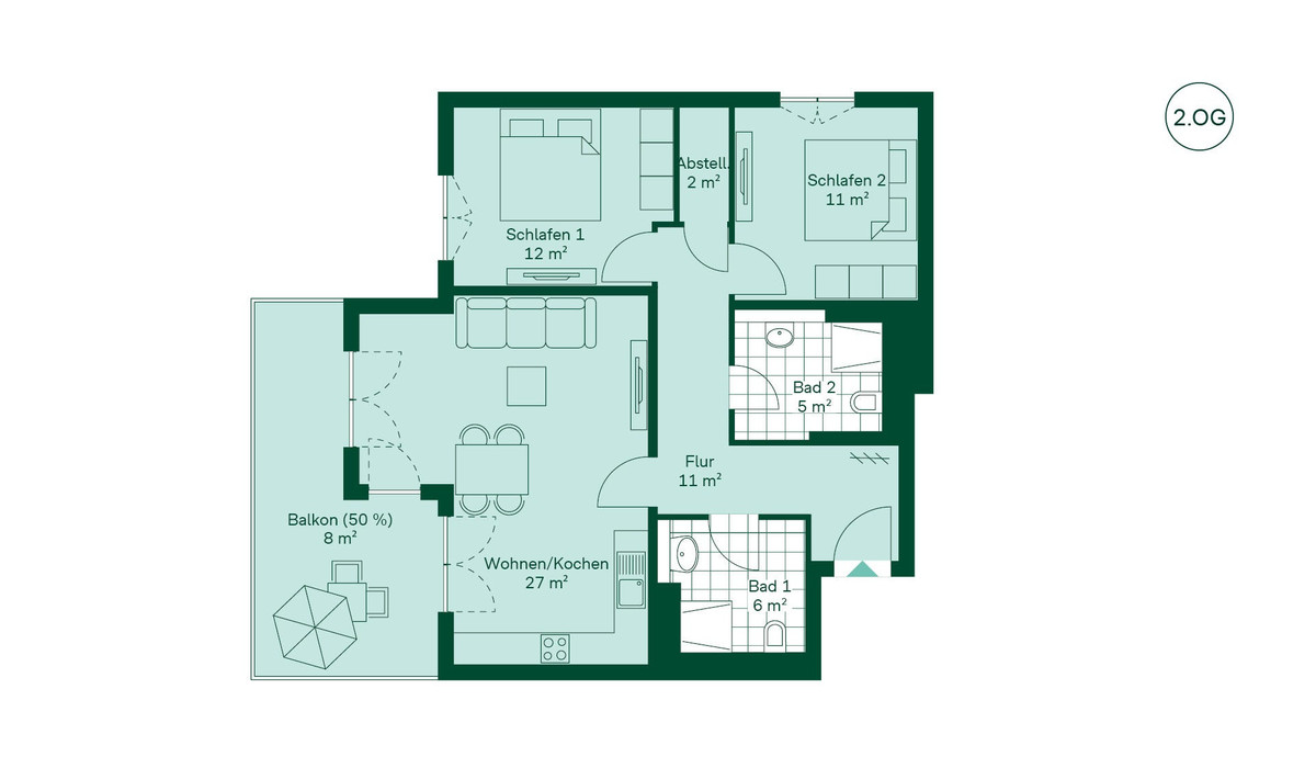 Zwei helle Schlafzimmer ermöglichen die nötige Privatsphäre und erholsamen Schlaf.Die beiden Bäder überzeugen durch je eine bodengleiche Dusche und moderne Armaturen. Eine effiziente Fußbodenheizung rundet das Angebot ab. Dank des Außenstellplatzes ist das Fahrzeug Ihrer Mieter stets gut aufgehoben.
