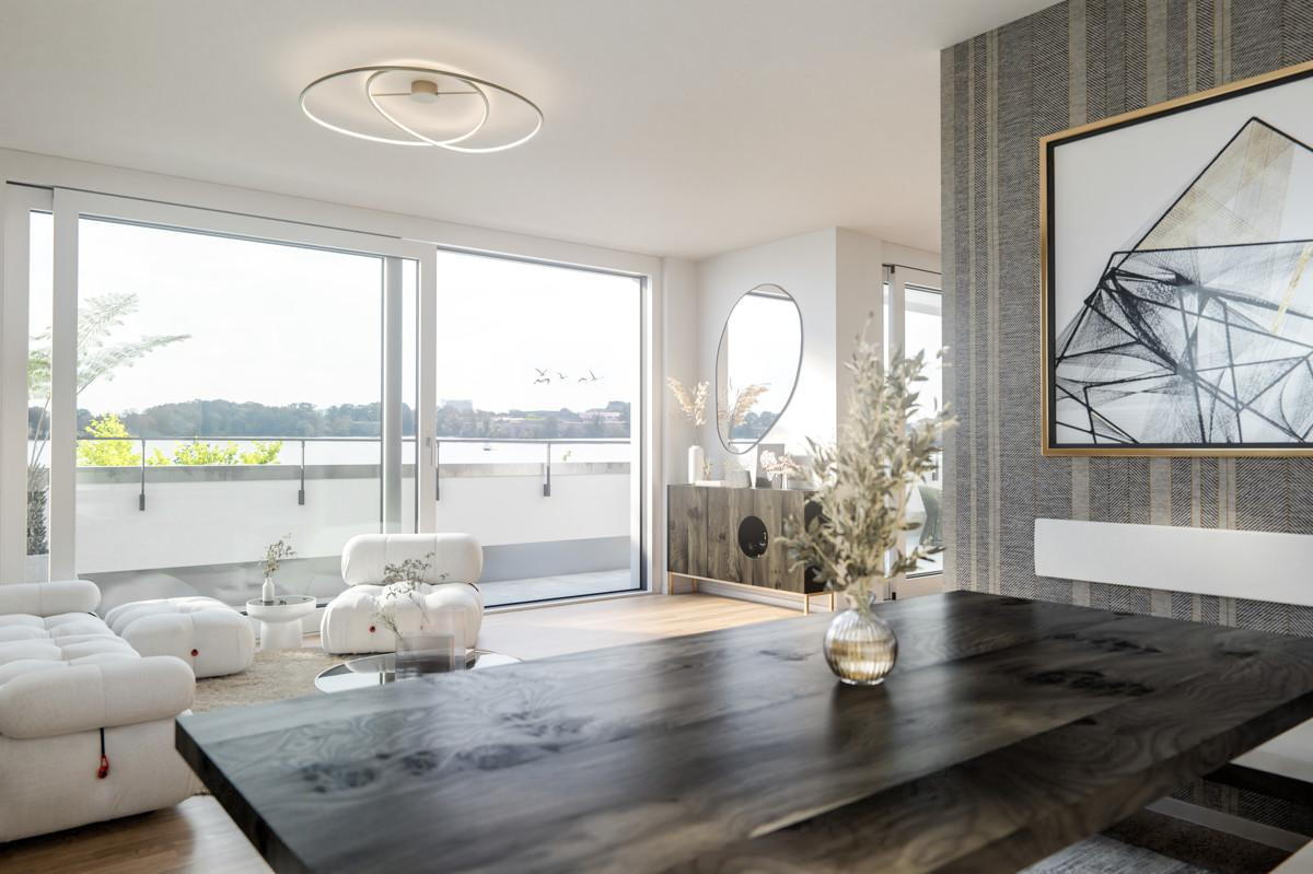 Die lichtdurchflutete Penthouse-Wohnung überzeugt durch ihre erlesene Ausstattung und zeitlosen Eleganz. Herzstück der Wohnung ist der offene Wohnbereich: Er bietet genügend Platz für einen Esstisch, an dem Sie mit Familie und Freunden zu einem köstlichen Abendessen zusammen kommen und für eine gemütliche Sitzecke, in der Sie entspannt den Tag ausklingen lassen können. Bodentiefe Fenster eröffnen einen spektakulären Blick auf das Wasser, der zu jeder Tageszeit für faszinierende Eindrücke sorgt.