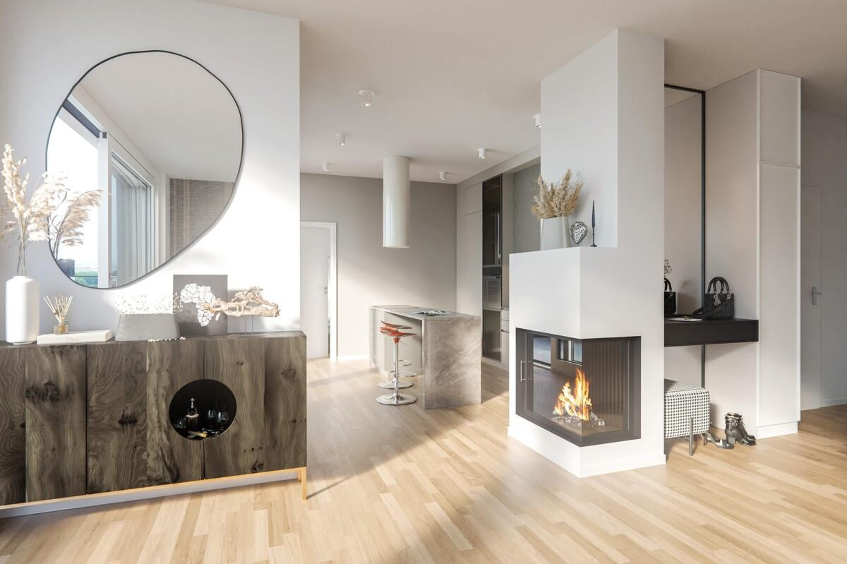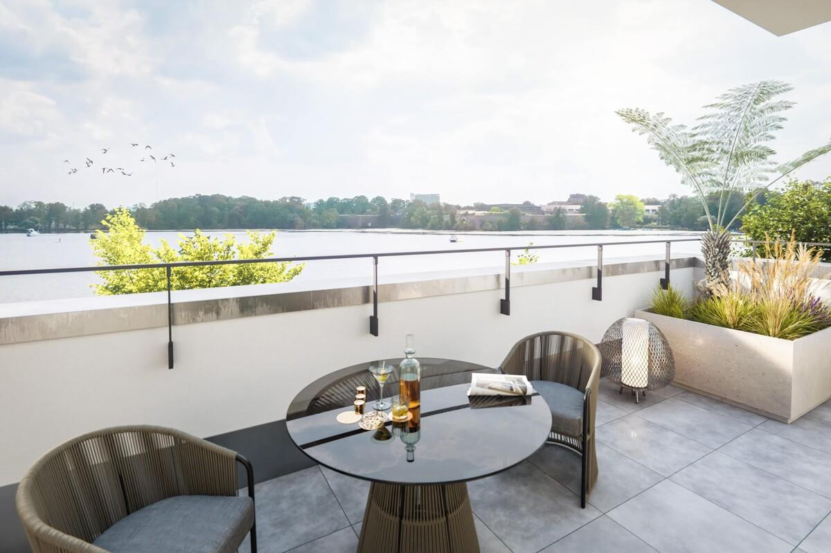 Zudem verfügt der Wohnbereich über eine Vorrichtung für einen Kamin - machen Sie es sich im Winter vor dem Kamin mit Blick über die vereiste Havel gemütlich. Auch eine Kochinsel kann installiert werden. Ein weiteres Highlight ist die umlaufende Terrasse: Hier können Sie im Sommer bei atemberaubendem Ausblick mit der Familie frühstücken oder sich bei malerischen Sonnenuntergängen ein Glas Wein gönnen und das Leben in vollen Zügen genießen. In den beiden großzügigen Badezimmern erwarten Sie hochwertige Markenfabrikate, eine Rainshower-Dusche und eine Badewanne. Ein Aufzug bringt Sie bequem von der Tiefgarage bis vor Ihre Wohnungstür.