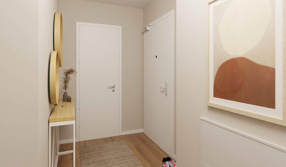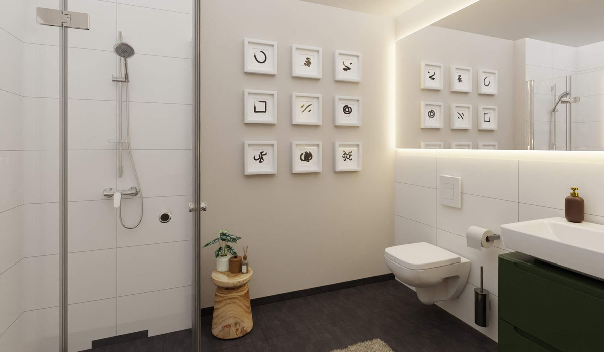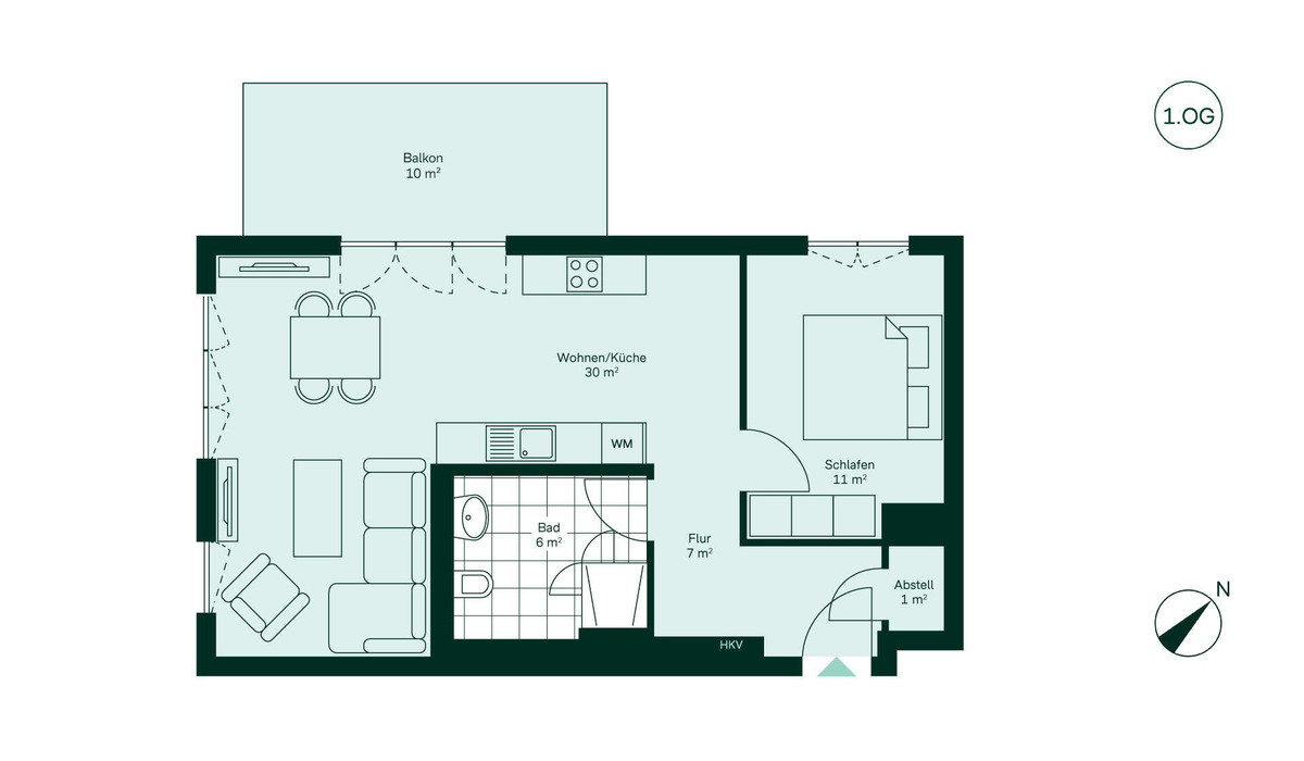 Diese Ferienwohnung überzeugt durch ihre klare Raumaufteilung, ideal für dauerhafte Vermietung oder saisonale Nutzung. Ein offener Eingangsbereich führt direkt in das Wohnzimmer mit integrierter Küche. Große Fenster bringen Tageslicht in den Wohnraum und schaffen den Zugang zum großzügigen Balkon. Die Küche ist offen und praktisch, optimal für unkomplizierte Abläufe. Das Schlafzimmer bietet eine ruhige Rückzugsmöglichkeit und das moderne Bad ist mit einer bodengleichen Dusche ausgestattet. Ein zusätzlicher Abstellraum schafft Stauraum für Ihre Feriengäste.