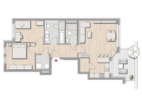 - Die Wohn-, Koch-, Kind- und Schlafbereiche sowie die Dielen und Abstellräume erhalten Bodenbelag nach Mustervorlage mit passender Sockelleiste.