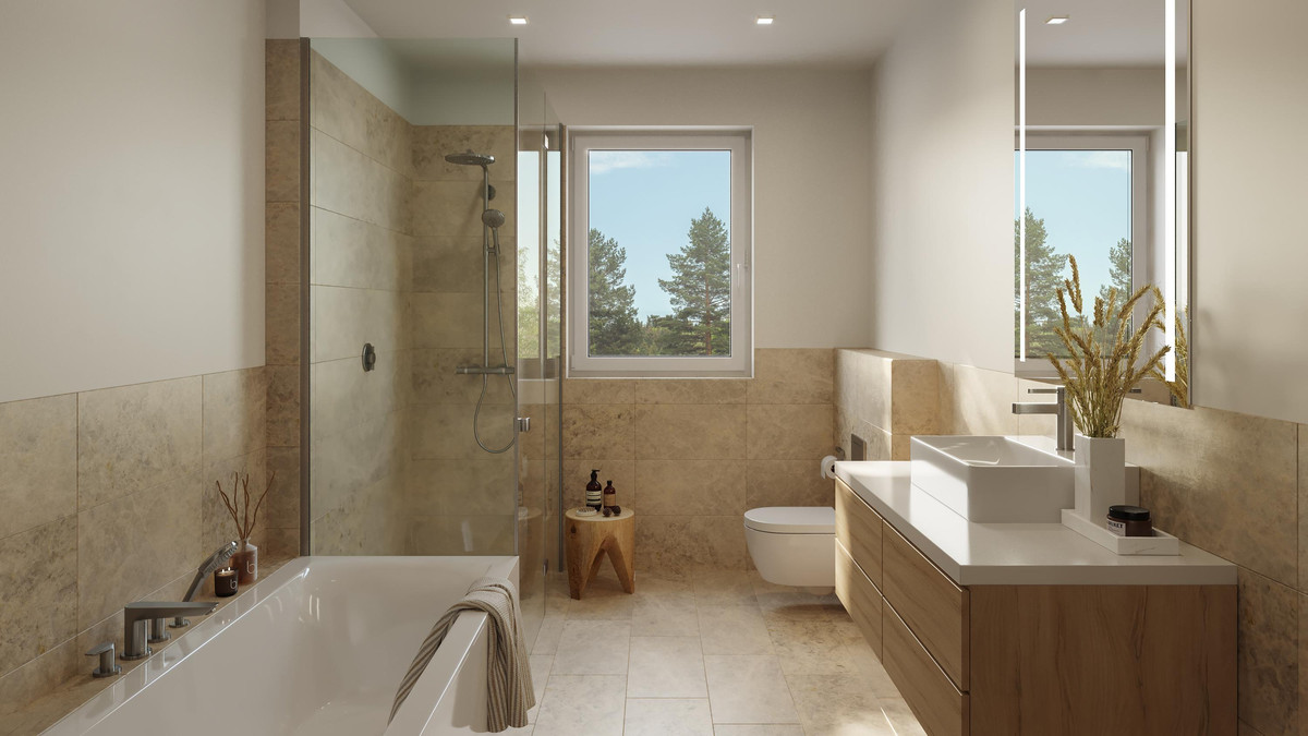 - Die Bäder und WCs werden im Bereich der Dusche raumhoch und die restlichen Wände bis Oberkante Vorwand ausgeführt. Die Bäder sind mit Badewanne und Dusche ausgestattet. Der bodengleich geflieste Duschbereich mit Ablaufrinne und Fliesenmulde erhält eine Klarglas-Duschabtrennung.