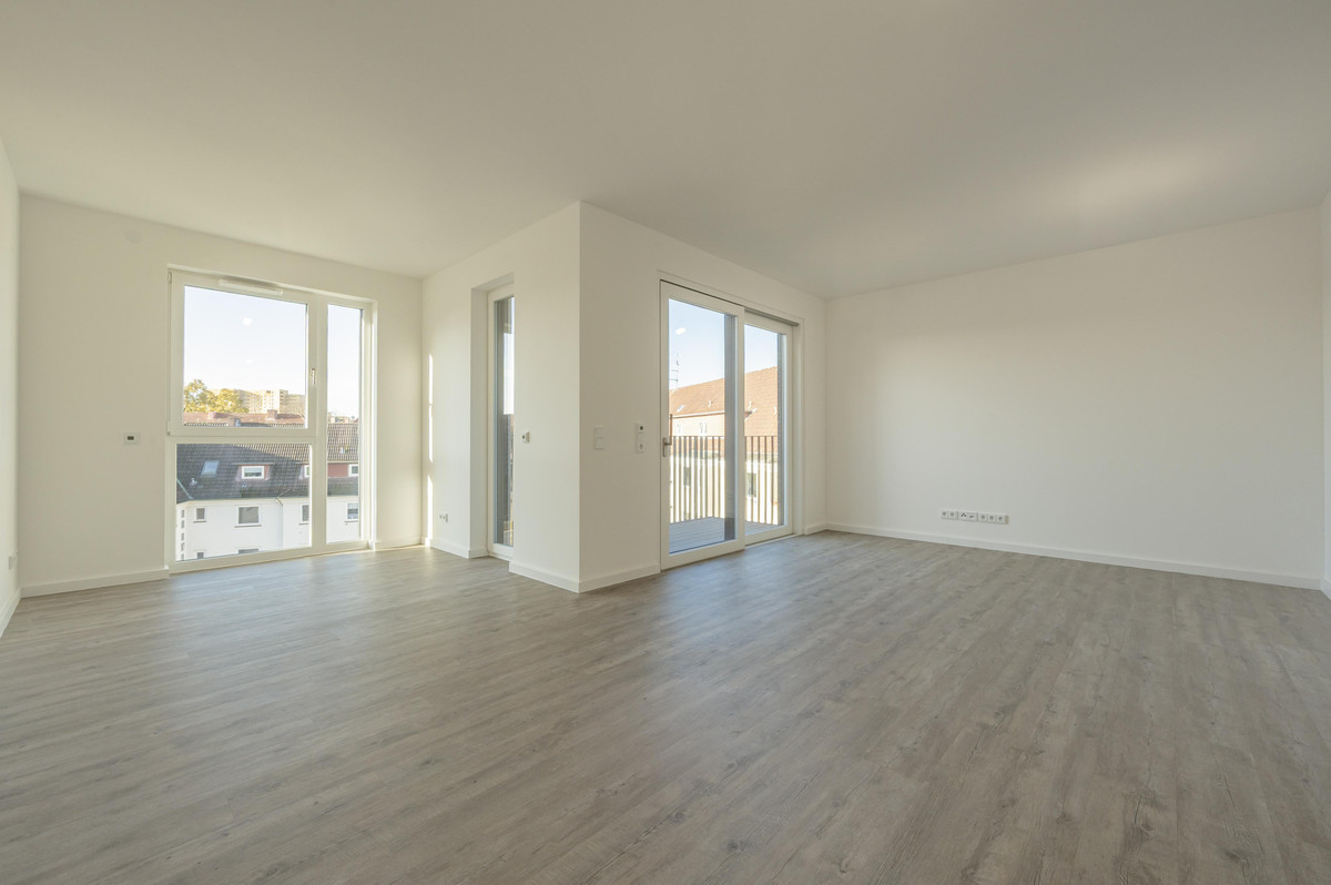 Die Wohnungen beeindrucken mit einer durchdachten Raumaufteilung, hochwertigen und pflegeleichten Materialien sowie einem stimmigen Wohnkonzept. Mittelpunkt jeder Einheit ist der offene Wohn-, Ess- und Kochbereich, der mit großen Fensterflächen und viel Tageslicht eine einladende Atmosphäre schafft.