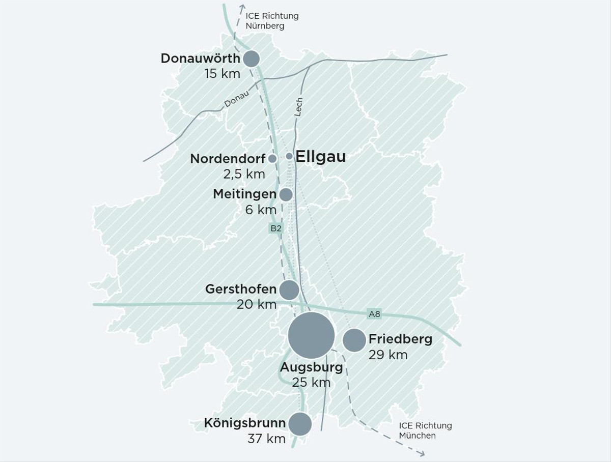 Trotz der ländlichen Lage ist Ellgau bestens angebunden: Über die B2 sind Augsburg, Donauwörth und Meitingen schnell zu erreichen.