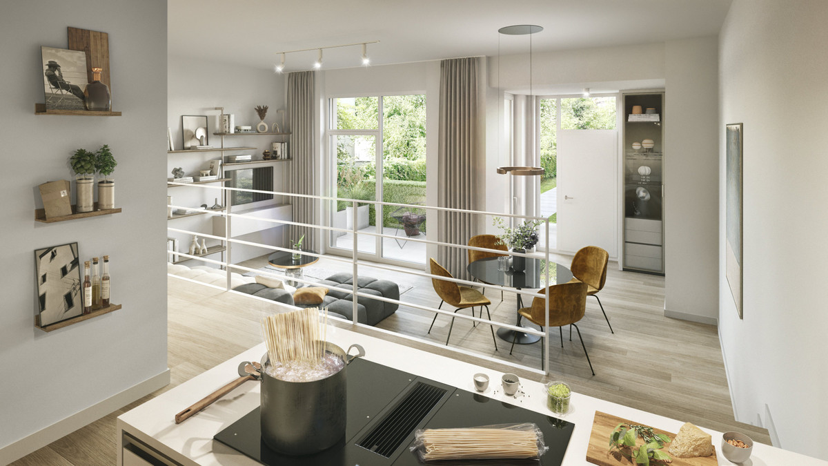 Ein besonderes Lichtkonzept in Teilbereichen des Projekts, Holz-Alu-Fensterrahmen, Türgriffe aus Edelstahl und attraktive Spindeltreppen bzw. offene, geradläufige Treppen aus Stahl mit Naturholzstufen in den Maisonettewohnungen sind nur ein paar der werthaltigen Ausstattungsmerkmale, die den Wohnkomfort ausmachen. Auch technisch überzeugt die Ausstattung aller Wohnungen: Mit Smarthome, einer modernen Steuerung von Heizung, Jalousien, Licht, Zugang, Paketbox etc., hat man über ein Terminal in der Wohnung und über eine App ständige Kontrolle.
