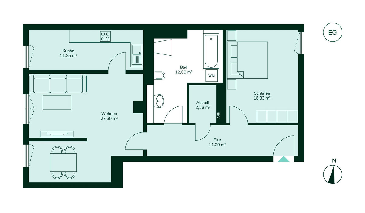 Willkommen in Ihrer neuen Eigentumswohnung im Erdgeschoss. Der großzügige Wohnbereich lädt zum Entspannen ein und bietet Platz für eine gemütliche Sofaecke sowie einen Essbereich. Die angrenzende Küche ist perfekt für kulinarische Abenteuer. Im Schlafzimmer finden Sie Ruhe und Komfort für erholsame Nächte. Das geräumige Badezimmer ist mit bodengleicher Dusche und Badewanne modern ausgestattet. Ein praktischer Abstellraum im Flur bietet zusätzlichen Stauraum. Der Flur verbindet alle Räume harmonisch.